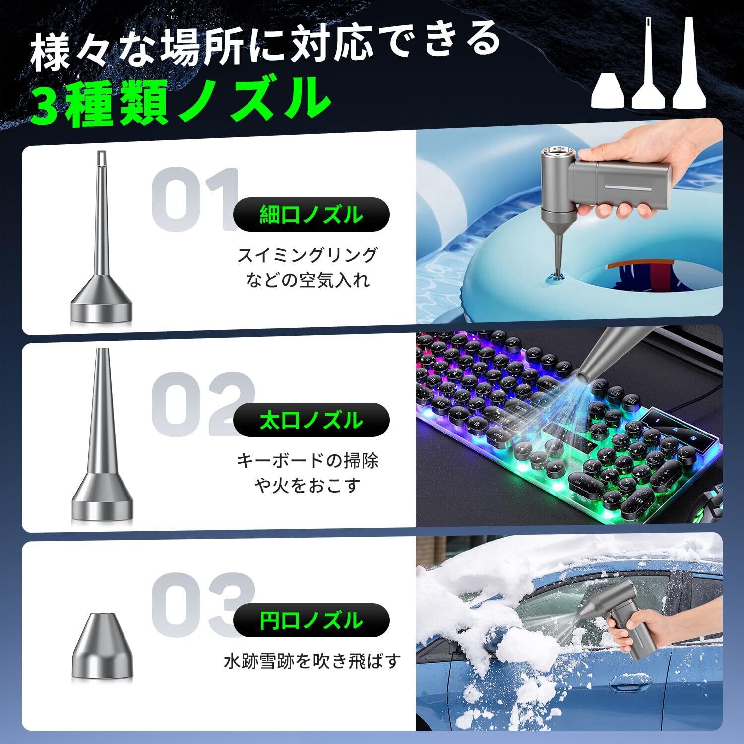 【高速回転&超強力噴射・3種類ノズル付き】 エアダスターは最新のブラシレスモーター技術を採用し、最大回転数250000RPM、最大風速101m/sを実現できます。製品と比較して圧倒的な風力を実現、強力な風量で、ぼこり・落ち葉・雪などを一瞬で吹き飛ばします。3種類のノズルを付属し、例えばエアコンの掃除・キーボードのホコリ・火をおこす・充気など、状況に合わせて適合なノズルを装着し、細かい場所でも簡単に使用OK!