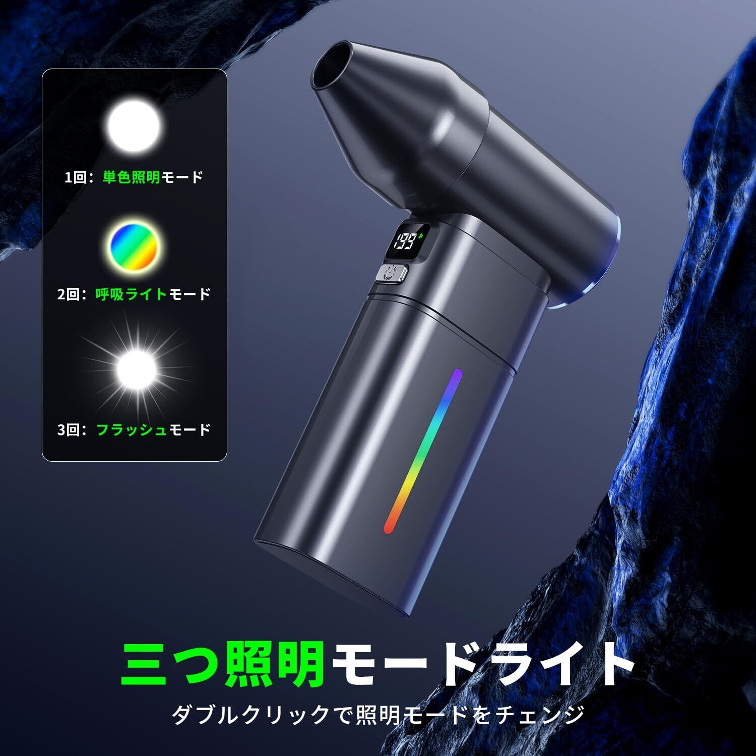 【5+1段階風量風量調整・3モードLEDライト】 エアダスターは前方ボタンと後方ボタン、5+1段階風量があります。前方ボタンは長押し不要で、5段階風量調整できます。一回ずつ押すと、風量をチェンジし、ディスプレイは5・25・50・75・100、5段階の風量を表示します。最低風量で約180分間連続使用可能です。後方ボタンは爆風モード、長押し必要があります。ディスプレイは199を表示し、強力な風量で、ホコリを一瞬に吹き飛ばします。手を離せば、爆風モードを停止し。また、本エアダスターは綺麗なLEDライトを装着し、単色照明モード・ランニングライトモード・フラッシュモードの三つ照明モードを調整できます。キャンプ場などのアンビエント照明に楽しみ。