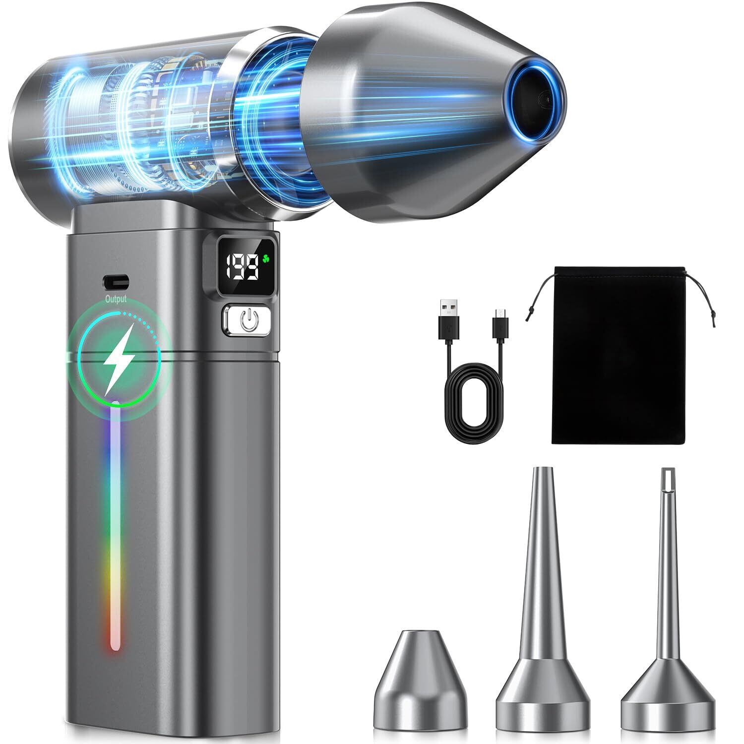 エアダスター ブロワー 強カ 洗車【2025年業界新技術・モバイルバッテリ一機能・金属外観】ディスプレイ&電量風量表示 省エネ対応 電動エアダスター 250000RPM高速回転 最大風速101m/s 5+1段階風量調整 7500mAh 180分連続使用 Type-c充電式 3モードLEDライト 3種類ノズル付き 250g 小型 洗車/車内/PC/キーボード/家具/掃除用等 説明書付き グレー