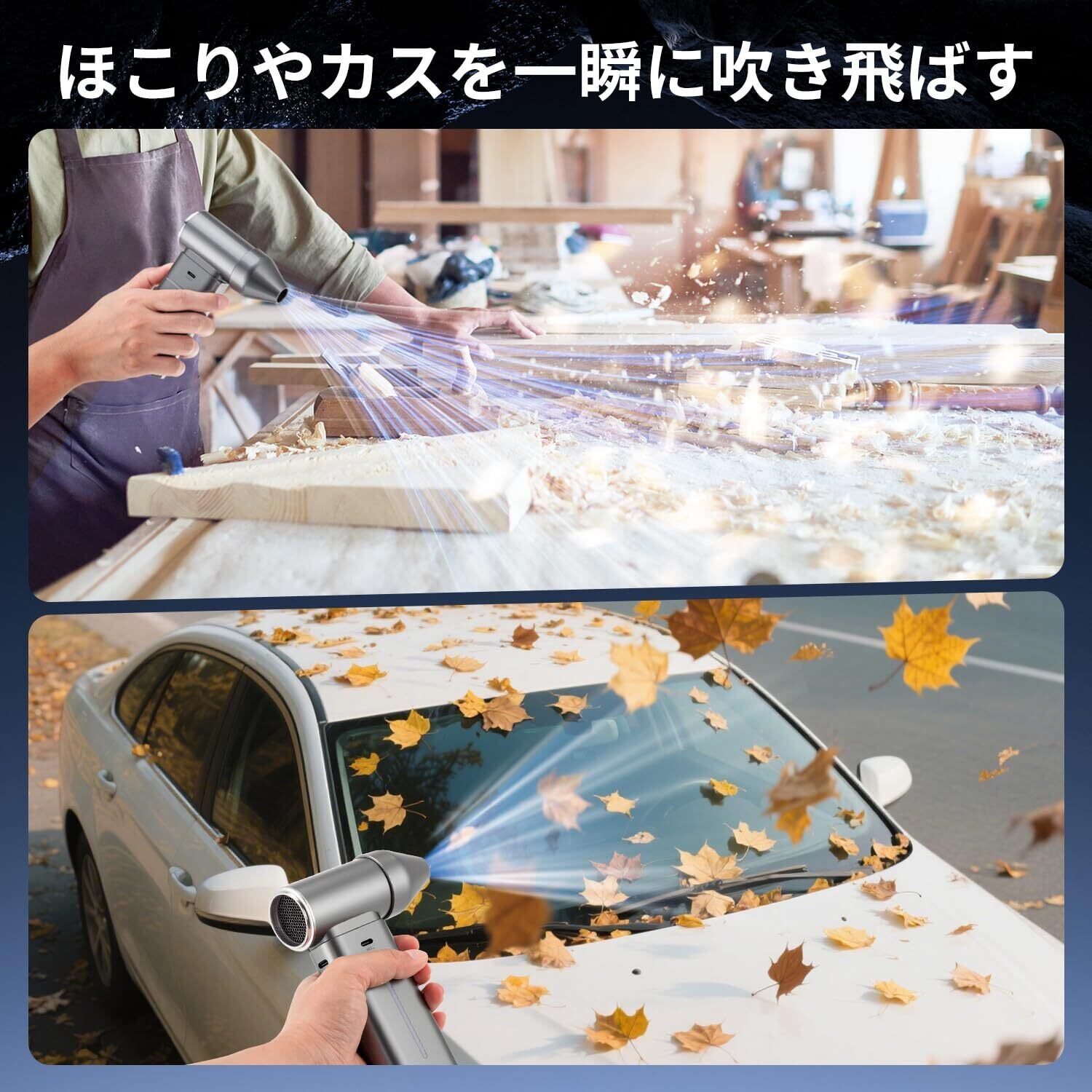「『エアダスター ブロワー』は、洗車やPC掃除はもちろん、家庭やオフィスでの多様な清掃シーンに最適な電動エアダスターです!最大風速101m/s、250000RPMの高回転で力強い風を生み出し、頑固な汚れや水滴を瞬時に吹き飛ばす驚異のパワーを体感いただけます!」