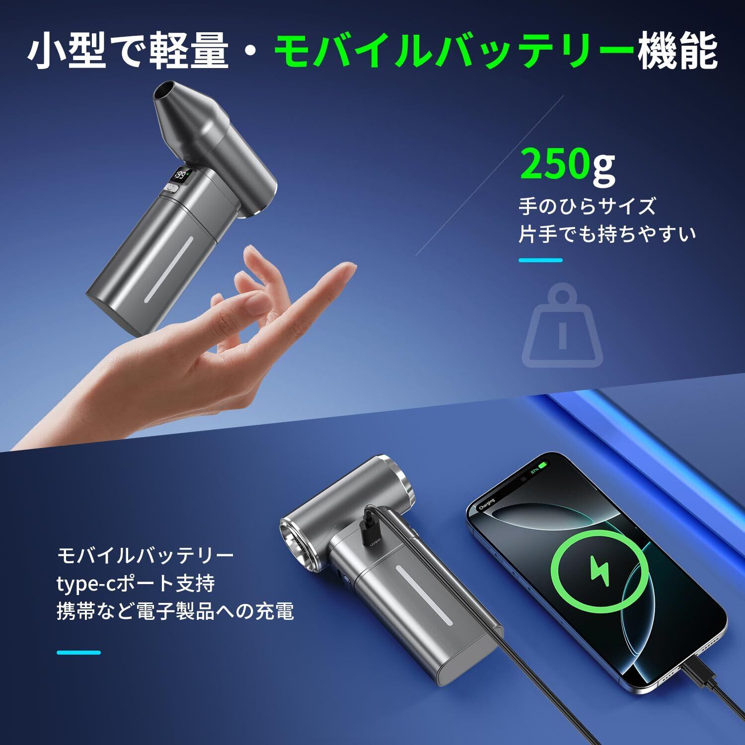 【モバイルバッテリー機能・ディスプレイ表示】 2025年専門研究所に共同開発するエアダスターは他製品がない、独特なモバイルバッテリー機能を搭載します。エアダスターの7500mAhバッテリーは専用的なモバイルバッテリーに負けず充電速度で携帯などの電子製品をフル充電できます。しかもType-C端子でコンセント・パソコン・車載充電など様々な場所でエアダスターを急速充電します。また、エアダスターは液晶ディスプレイを装着します。使用中の風速モードと残っている電量を表示します。一目でわかる便利さは他製品に及ぶことができない。(注意モバイルバッテリーのポートはType-C口、出力電圧は5V2A)