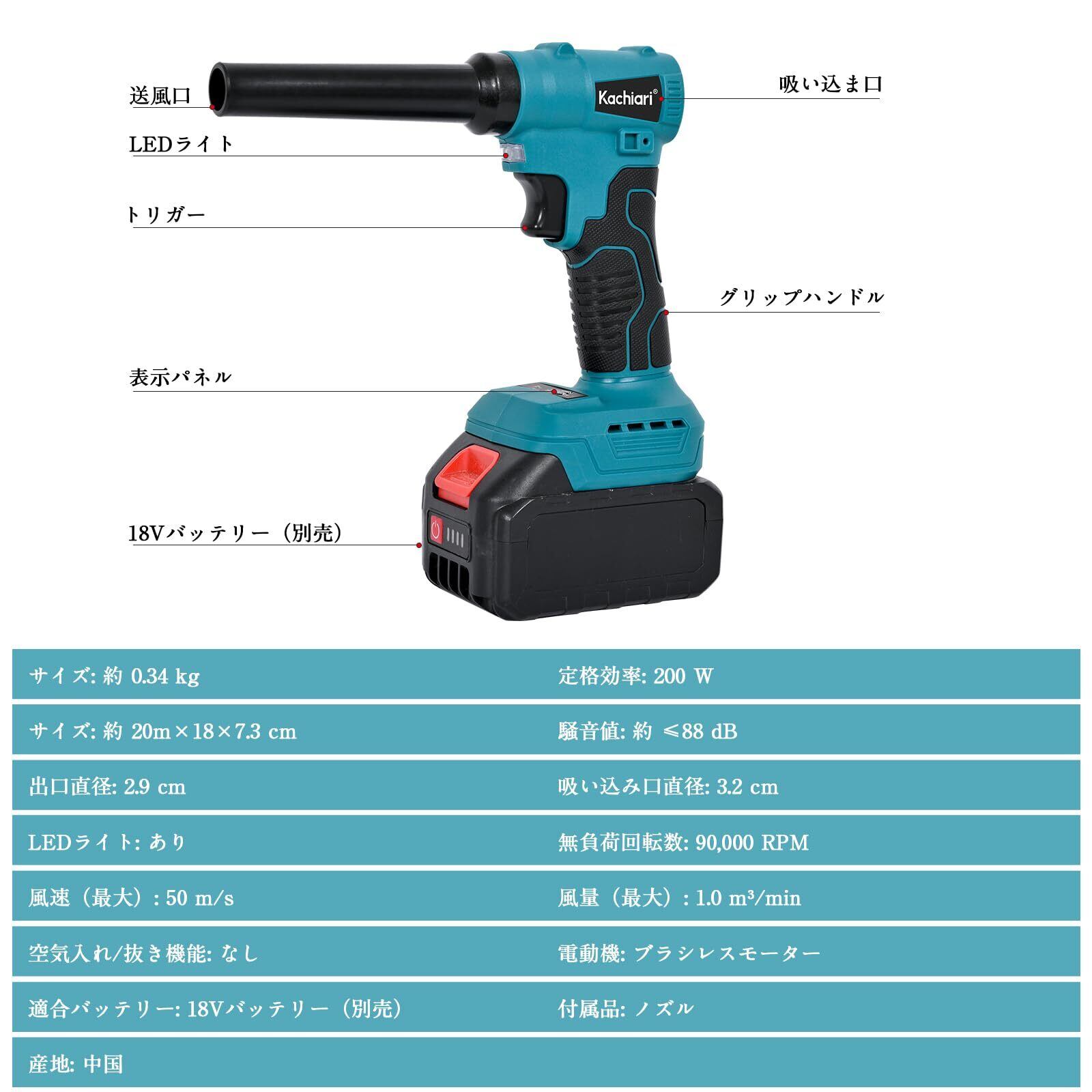 【充電式エアダスターの仕様】■型番:充電式エアダスター KA-18 ■定格効率 :200 W ■騒音値:≤88 dB ■出口直径:2.9 cm ■吸い込み口直径:3.2 cm ■LEDライト:あり ■無負荷回転数:90,000 RPM ■風速(最大):50 m/s ■風量(最大):1.0 m³/min ■空気入れ/抜き機能:なし ■電動機:ブラシレスモーター搭載 ■本体サイズ:約 20m×18×7.3 cm ■質量:約0.34 kg ■付属品:ノズル ■生産国:中国