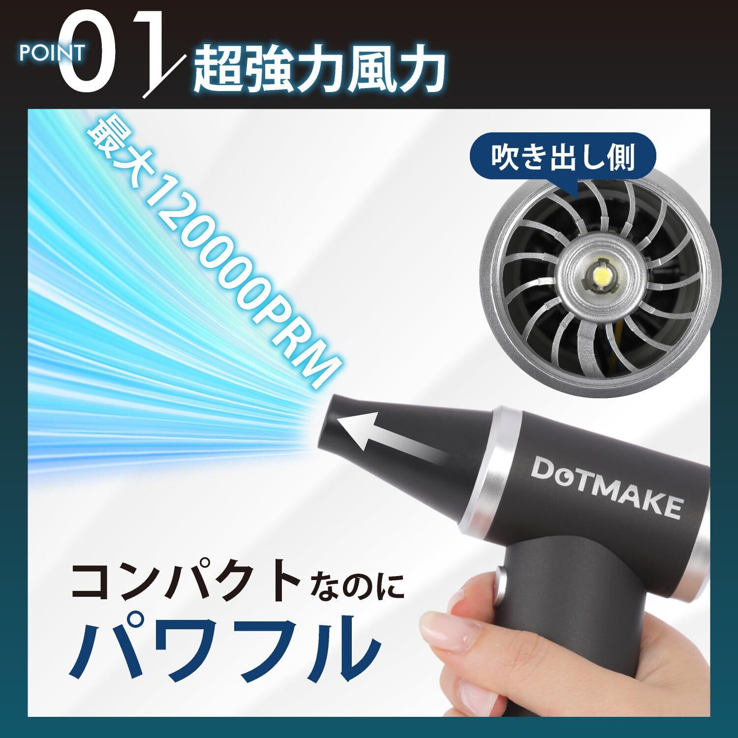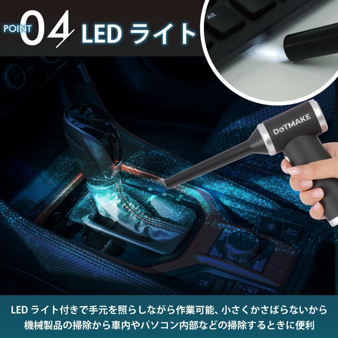 「『DOT MAKE エアダスター』は、全てのクリーニングシーンに理想的なパートナーです!120,000RPMの強力な回転数を誇り、使いやすい5段階風力調整で、多様な場面に応じた効率的な掃除をサポートします。PCやキーボード、車内、エアコンなど、あらゆる場所の汚れを瞬時に吹き飛ばすことができます。」