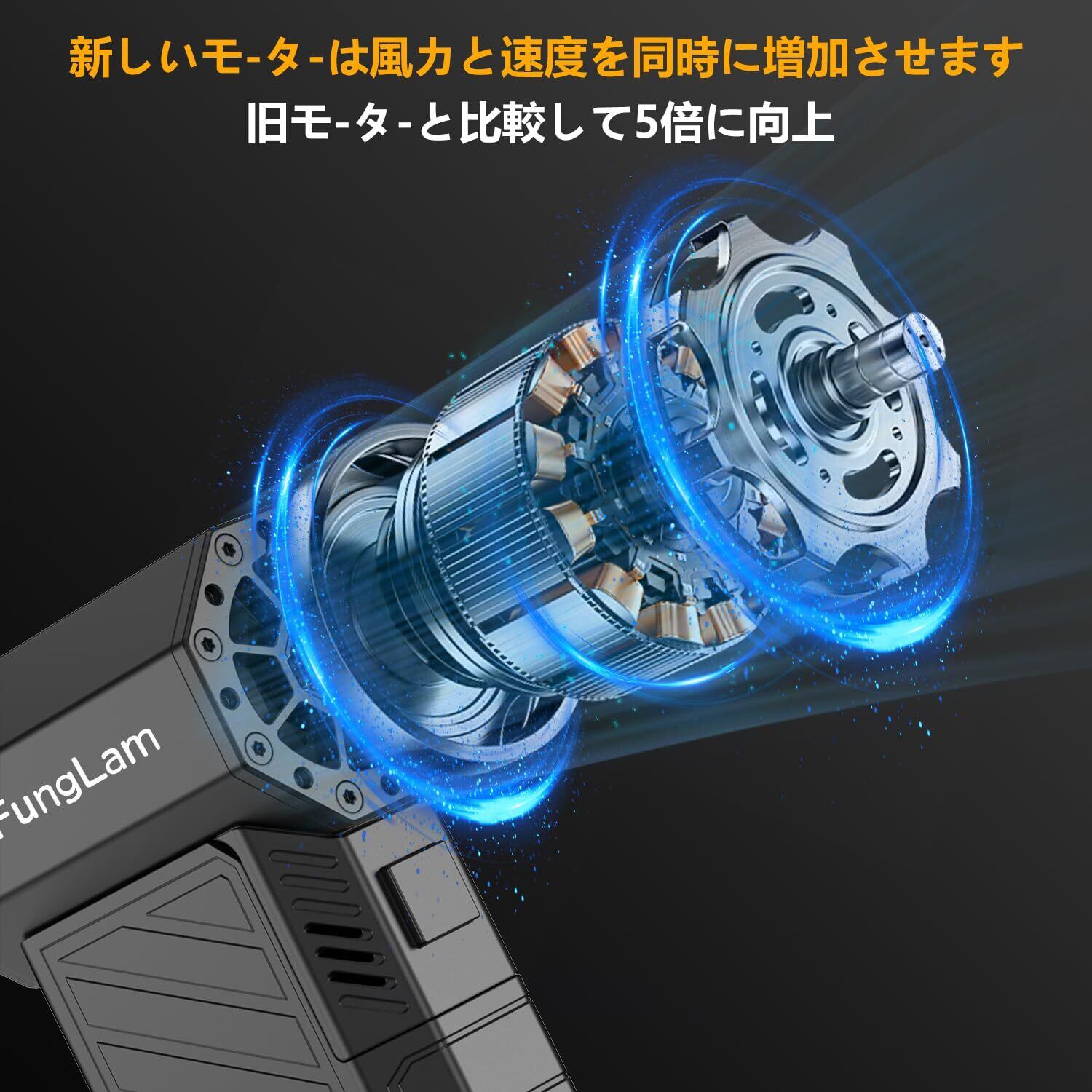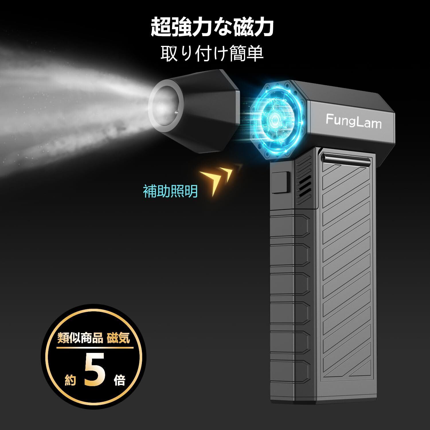 「『Funglam エアダスター』は、驚異の風速55M/Sを誇る強力な電動エアダスターです!交換可能なバッテリーベースを搭載し、3000mAhの大容量バッテリーで、長時間の使用が可能です。洗車や車内掃除、またペットやパソコン周りのほこり取りに最適な一台です!」