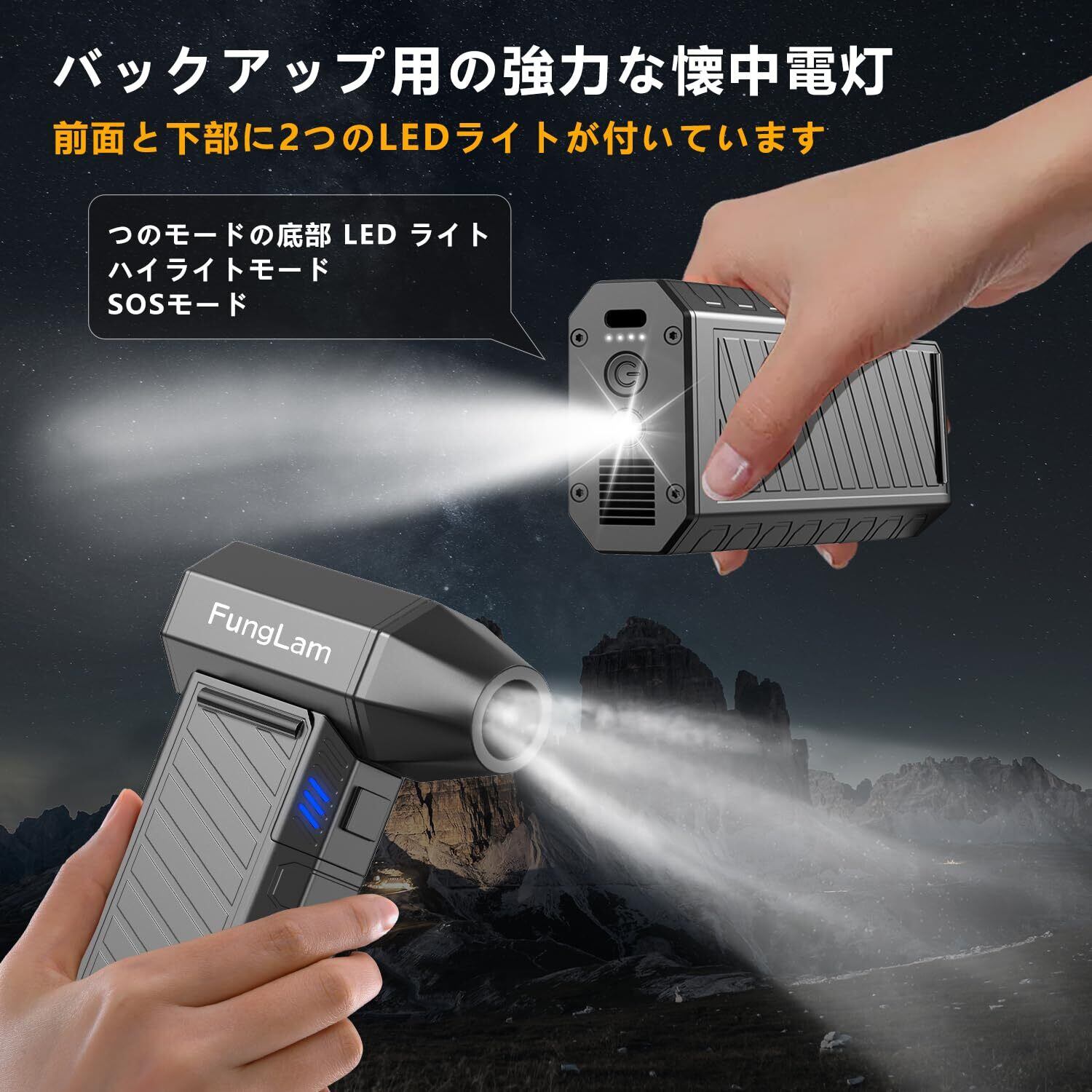 前方・下方の2カ所にLED照明:当社のエアダスターは、前方と下方にそれぞれ照明を搭載しています。前方の強力なライトは対象物を鮮明に照らすことができ、下方の照明は強光照明とSOS救難モードの2つのモードがあり、アウトドアでの冒険に最適です。