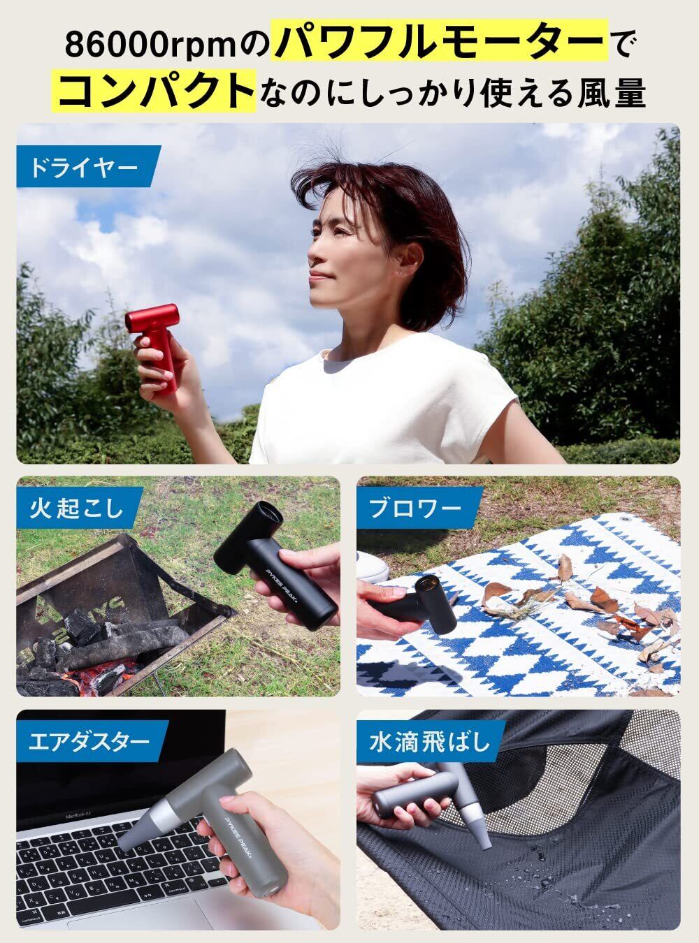 「『PYKES PEAK 電動エアダスター ミニジェットファン』は、コンパクトなのに驚くべき風力を実現した優れたクリーニングツールです!風量調整機能を搭載し、4段階で使い分け可能。PCやキーボードの掃除から、アウトドアでの使用まで幅広く活躍します。」