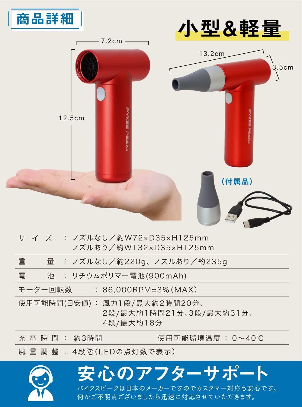 【仕様 / セット内容 / メーカー】【仕様】本体サイズ:73mm(上部)×124mm(高さ)×35mm(持ち手直径)、重量220g、4段階風量調整可能【セット内容】本体、先端ノズル、充電用USBケーブル、取扱説明書/書(日本語)【メーカー1ヶ月】PYKES PEAK製品の販売元は日本です。カスタマー対応も日本人スタッフが日本語で丁寧に対応いたします。初期不良や故障などの場合は、公式ライン「@pykespeak」もしくは、メール「[email protected]」までご気軽にご連絡ください。製品を含めご対応させて頂きます。