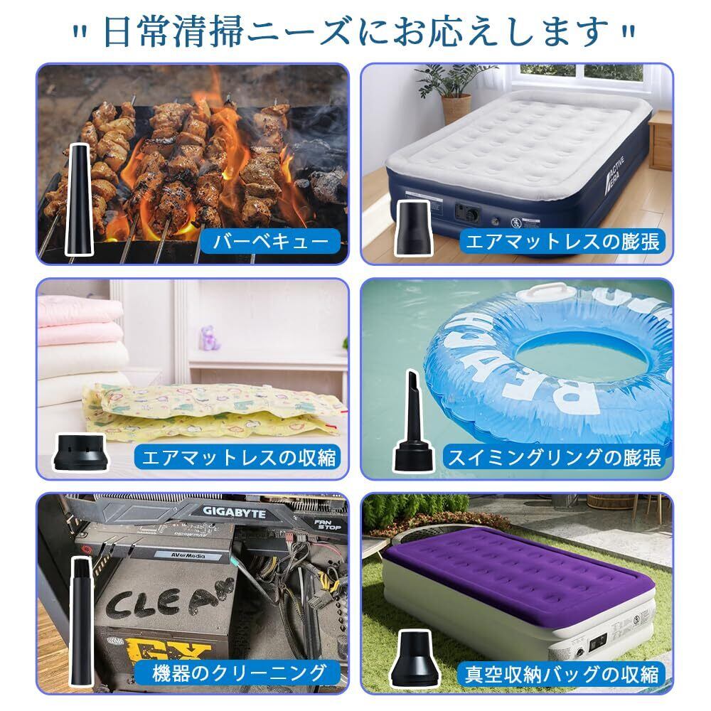 【6種類ノズル付属:複数用途】さまざまな使用ニーズを満たすために6つ異なるノズルが装備されています。ブラシ付きノズルは、コンピューターケースやキーボード掃除用だけでなく、車の内装と窓などのほこり取りにももちろん、小さなインフレータブルノズルを使用して子供の水泳ラップ、ヨガボールを膨らませたり、長いノズルを使用して庭のバーベキューでの家族の集まりで炭の燃焼をスピードアップしたりすることもできます。 高さの異なる 2 つのノズルを使用して、エアベッドのガスをすばやく排出できます。