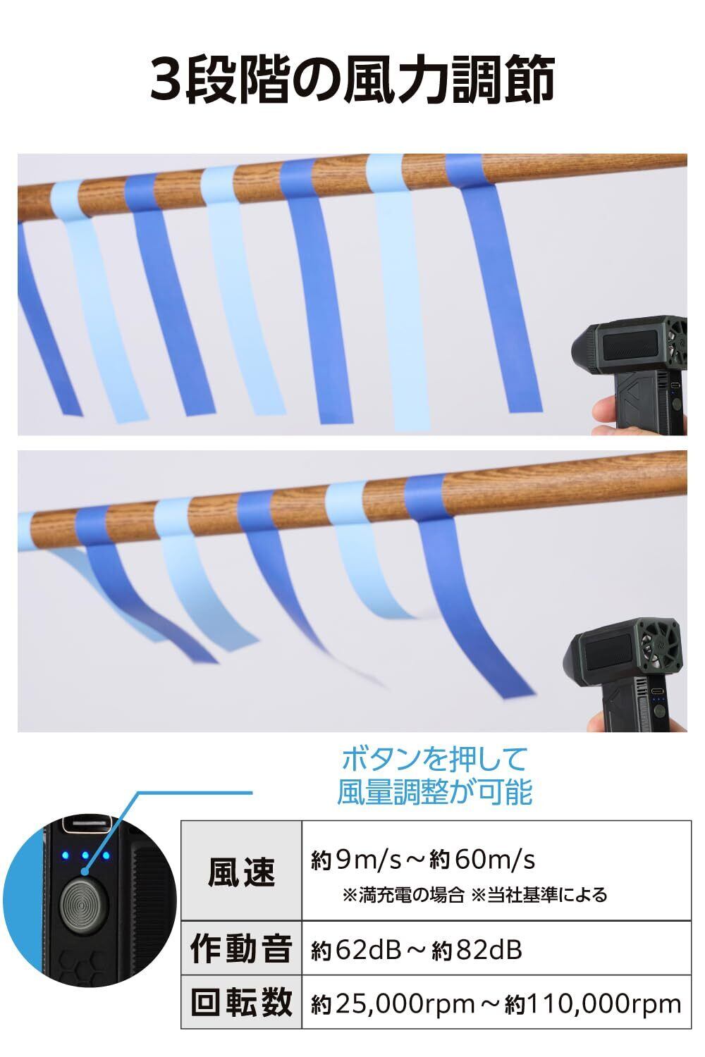 - 最大110000RPMの強力な風速で効果的に掃除!