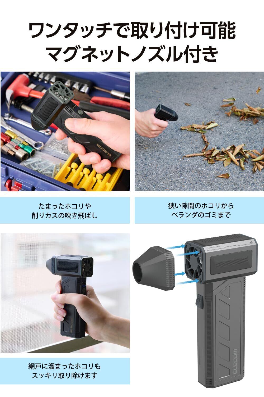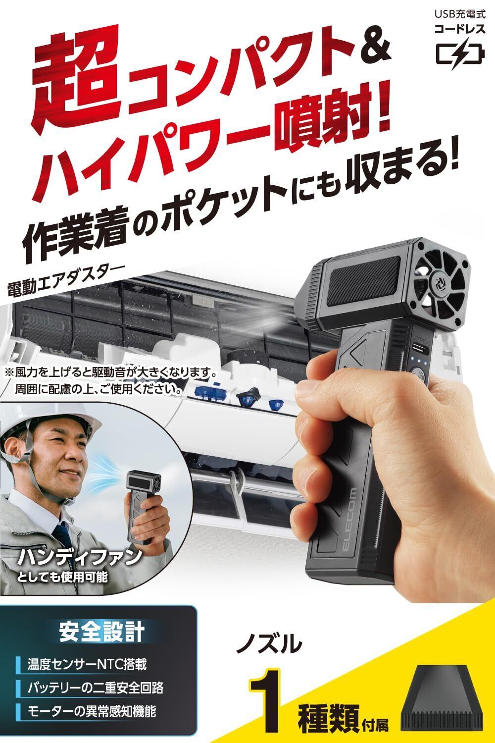 「『エレコム 電動エアダスター』は、110000RPMの高速回転を誇る強力なエアダスターです!家庭やオフィス、車内の清掃に最適で、コンパクトで持ち運びやすさも兼ね備えています。最大風速60m/sのパワフルな風で、ホコリやゴミを一瞬で吹き飛ばします。」