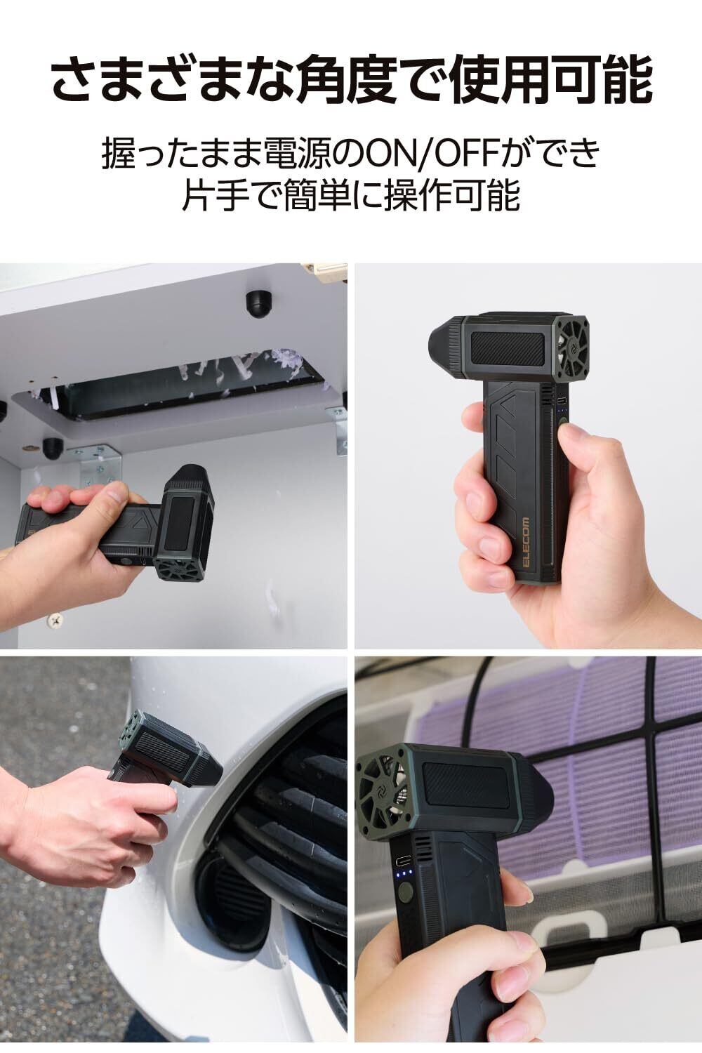 「電子機器や車だけでなく、家庭やオフィスなどの様々なシーンで活躍する電動エアダスターです。また、充電式のため、配線に悩まされることなく、自由に使用できるのが魅力です。」