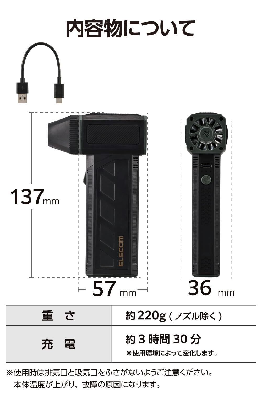 ■内容物:電動エアダスター本体、マグネット付き噴射ノズル、USB-A - USB Type-C(TM)ケーブル