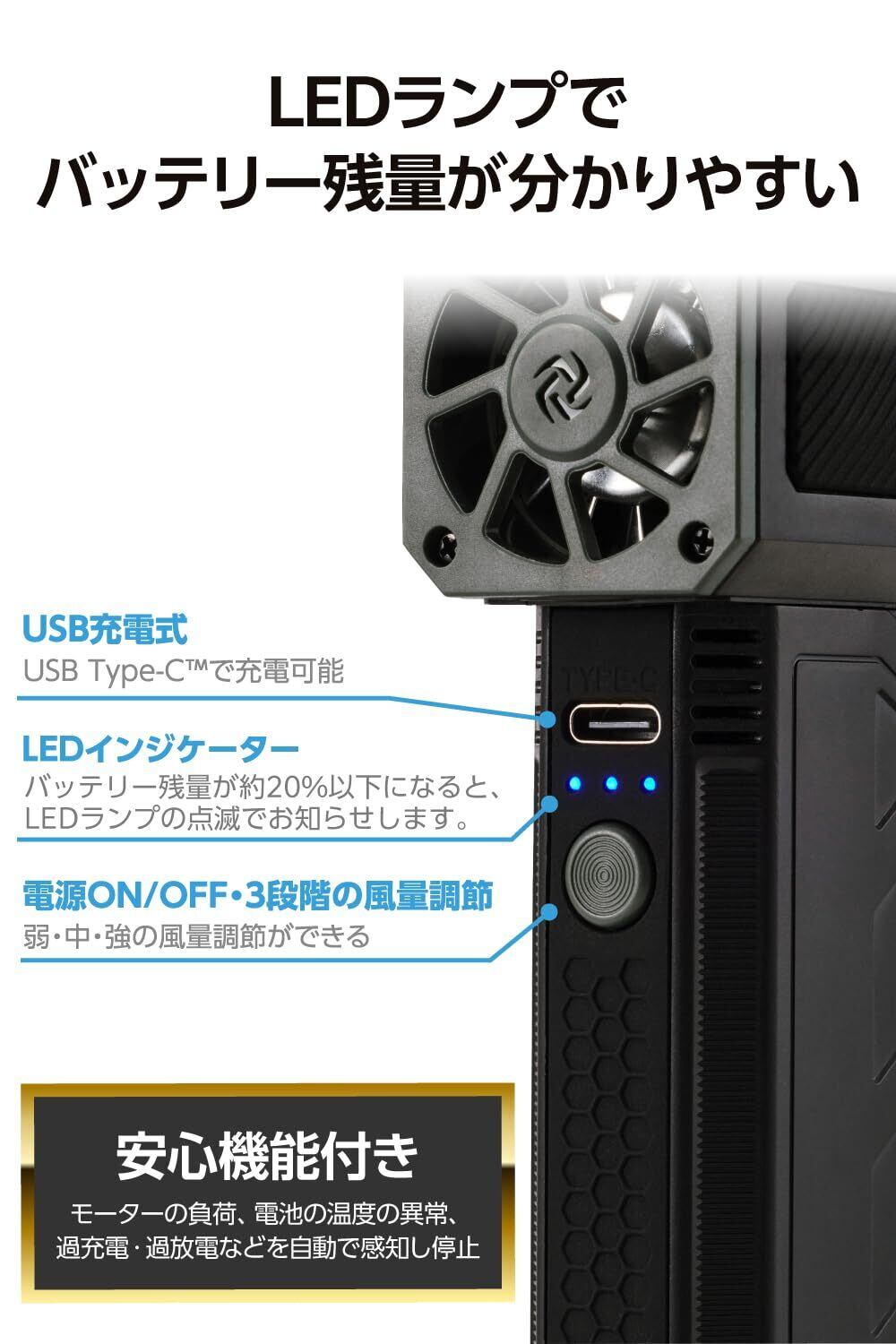 ■モーターの負荷、電池の温度の異常、過充電・過放電などを自動で感知し停止する安心機能付き。大切なバッテリーをしっかり守り、長く使えます。
