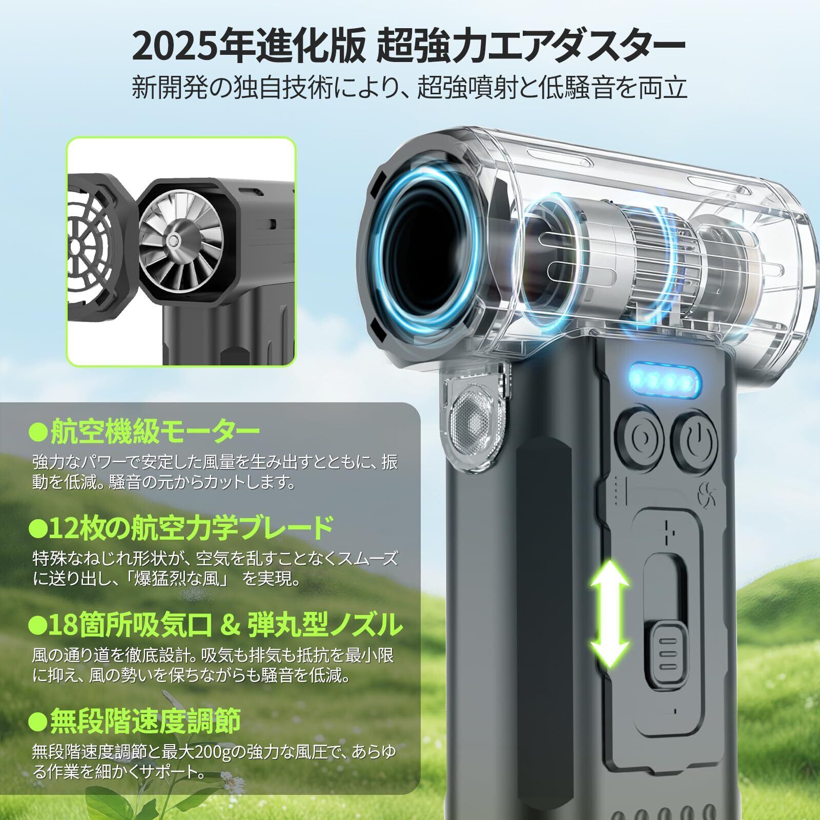【風量を200%アップ】【48dB超低騒音】「小さくても、とことん強く」――その想いから生まれた、まったく新しいエアダスターができました。2年間、私たちがこだわり続けたのは、「使いやすさ」と「頼れる性能」の両立。もう、従来品の風力不足、うるさい音やかさばる大きさに我慢する必要はありません。この進化を支えるのは、4つの独自技術です。①航空機に使われる技術を応用した高出力モーター、②風をまとめてパワーを高める12枚の特殊ねじれブレード、③スムーズな風の流れをつくる18の吸気口と弾丸型ノズル、④そして細かい風量調節ができる無段階調整機能。その結果、風量は200%アップしながら、動作音は48dB以下の静かさ、最大200gの風圧をを実現します。