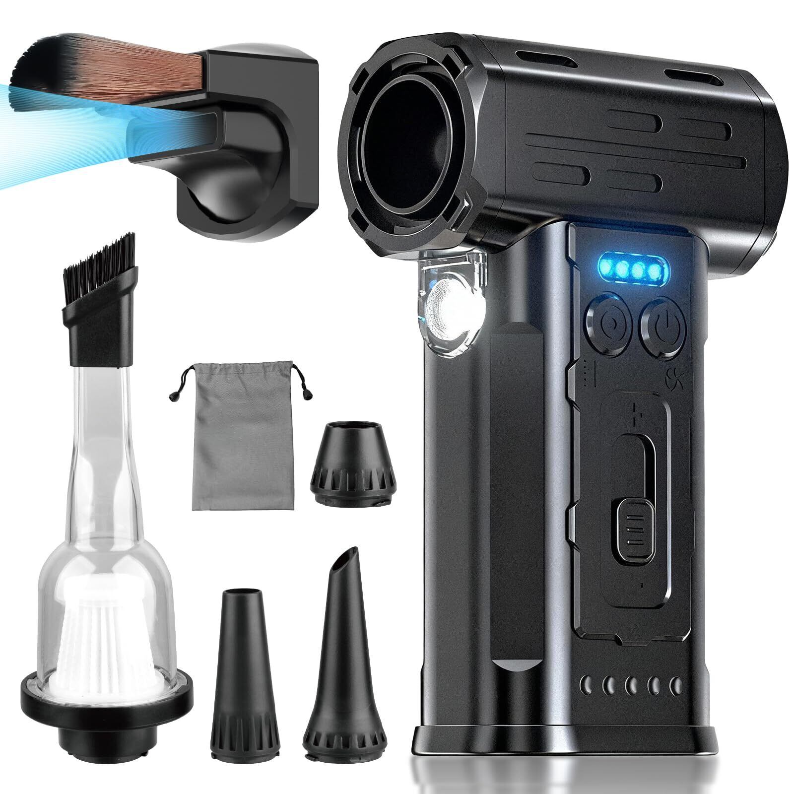 YIREAL 電動 エアダスター【2025改良強化版・多機能7in1】【吹く・吸う・LEDライト・ 車用 掃除機・コードレス ドライヤー・ BBQガンブロー】300,000RPM ブロワー ハンディクリーナー 航空級モーター・AI節電 ・強力吸引力 ・小型クリーナー 【8000mAh大容量バッテリー・ 無段階風量・5種類ノズル付き】洗車/PC掃除/キーボード/家具/車内/エアコン用/送風機