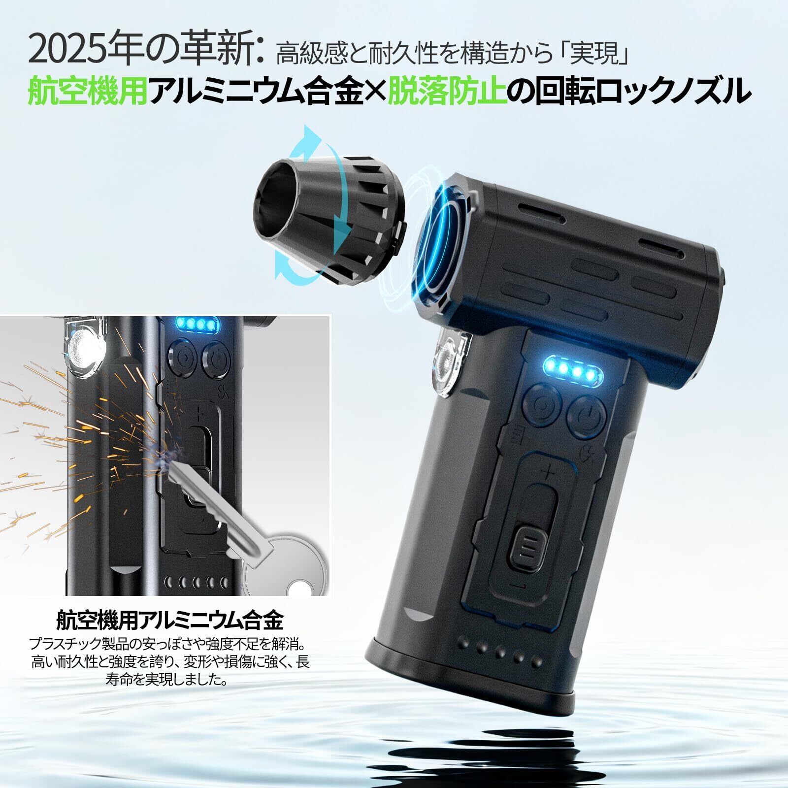 【2年】【2025年の革新エアダスター :アルミ合金×回転ロック!高級感と耐久性を構造から「実現」!】 市販品によくあるABS樹脂とは一線を画す、高級感あるアルミ合金ボディを採用。プラスチック製品の安っぽさや強度不足を解消し、変形や損傷に強く、長寿命を実現しました。ノズルは磁気式によある脱落を防ぐ「回転ロック機構」を採用。たった2秒で確実に装着でき、4方向調節可能なため、あらゆる作業姿勢に対応。強風圧下でも緩まず、プロの使用に耐える確かな固定性を実現しています。すべての製品は出荷前に厳格な品質検査を実施し、さらに2年間の長期で万が一の際も安心。確かな品質と充実のサポートで、快適なユーザー体験をお届けします。