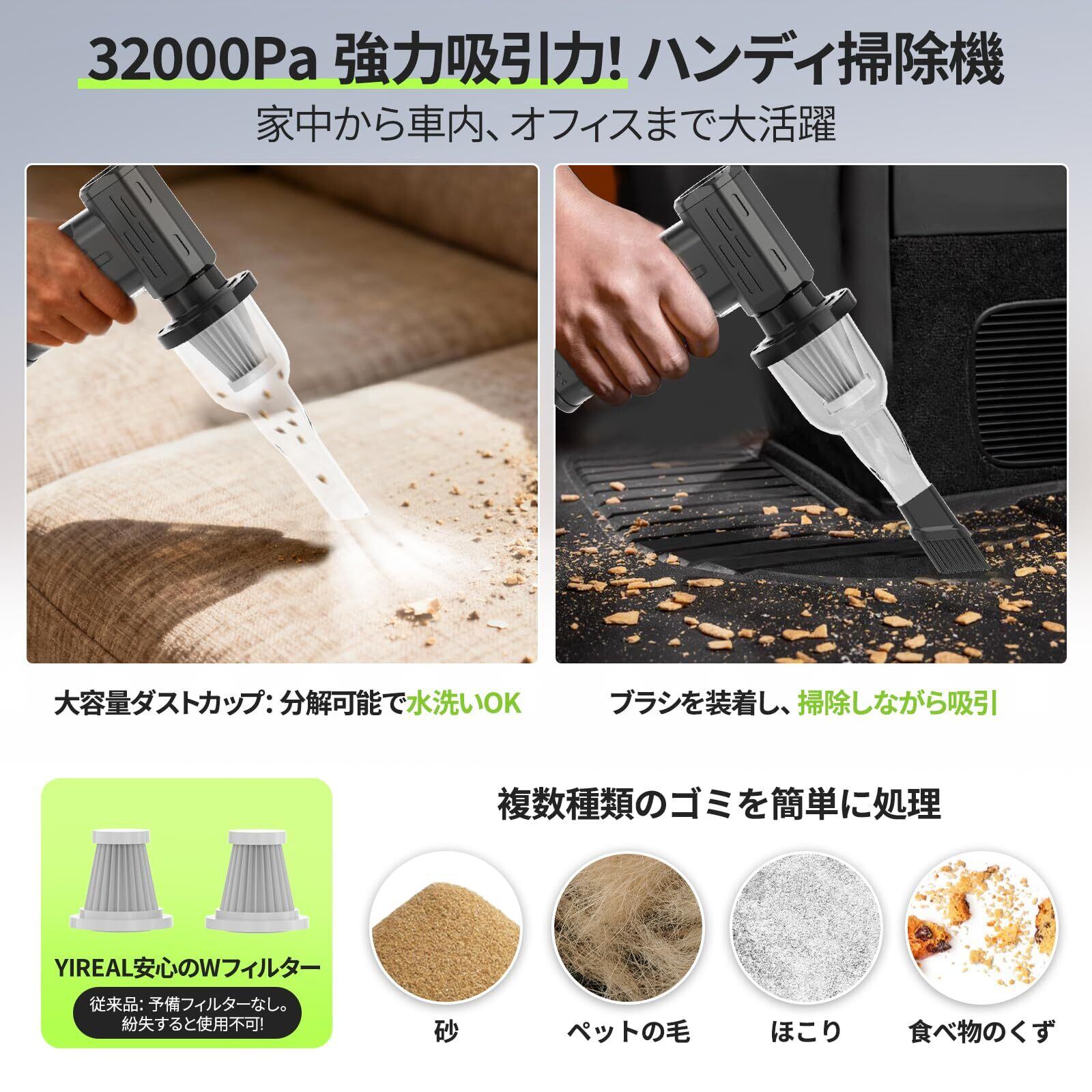 「『YIREAL 電動 エアダスター』は、300,000RPMの高速回転を誇る高性能エアダスター! 吹く、吸う、LEDライト機能を兼ね備えた多機能設計で、家や車の清掃からBBQの炭の火おこしまで幅広く対応します。コンパクトでコードレスのため、持ち運びやすさも抜群です。」