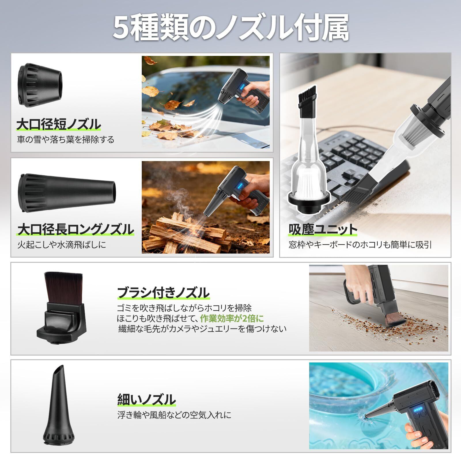 【吹く&吸うの両用設計!これ1台で、お掃除が楽になる!】 ① 〖圧倒的強風で、面倒な作業を一瞬で〗 300,000RPMの超強風が、落ち葉や洗車後の水気、砂ぼこりを瞬時に吹き飛ばし、広い範囲の作業も素早く完了させます。 ② 〖驚異の吸引力で、細かいゴミまでキャッチ〗 32,000Paの高吸引力で、ペットの毛や食べかすもらくらく吸引。水洗い可能なダストカップと紛失防止のWフィルターで、お手入れも簡単です。 ③ 〖5種類ノズルで、隙間掃除もらくらく〗 パソコン内部やエアコン吹き出し口、窓サッシなど、手の届きにくい狭い隙間のホコリをストレスなく徹底清掃。 ④ 〖業界初!デリケートな物も安心のソフトブラシノズル〗 カメラやジュエリーなど傷つきやすい貴重品専用。吹きながらブラシで払うダブル効果で、作業効率が約2倍にアップ。 ⑤ 〖6in1マルチツール!一台で多彩なシーンに対応〗 ブロワーにクリーナー、BBQの火おこし、浮き輪の空気入れ、キャンプライト、コードレスヘアドライヤーとしても活用可能。