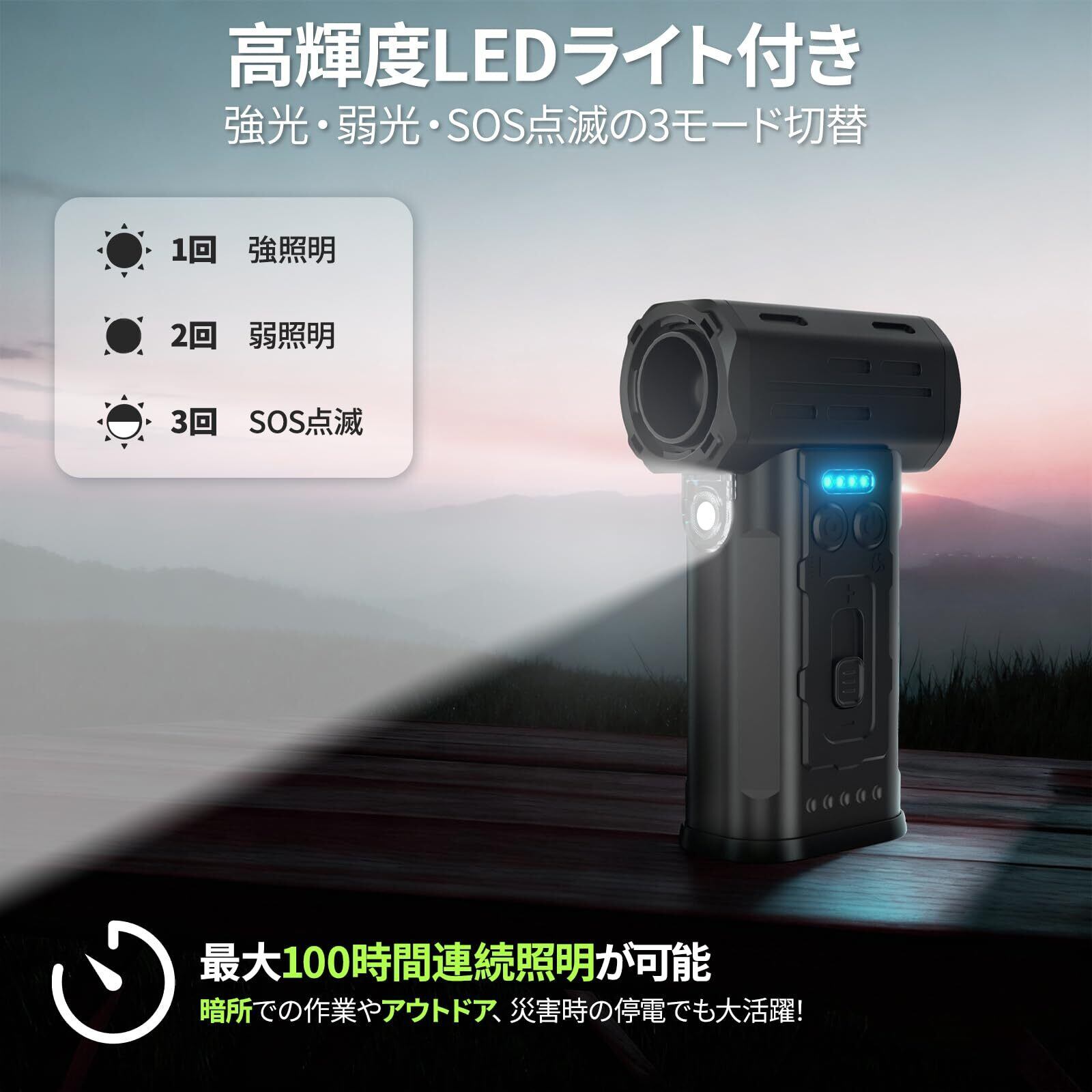 【8000mAhの大容量バッテリー、LEDディスプレイ】内蔵の8000mAh大容量バッテリー(実容量)は、小風時最大150分、最大強風時でも25分の連続使用を可能にします。電動エアダスターは3A Type-C急速充電により約3時間で満充電となり、残量確認機能で作業中の突然の電源切れを防ぎ、作業進捗を確実に管理できます。さらに、高輝度LEDライトを装備。暗所での作業時もほこりを迅速かつ正確に発見・除去できます。ワンタッチで「強光」「弱光」「緊急SOS点滅」の3モードを切替可能で、最大100時間にも及ぶ連続照明は、暗い作業現場、アウトドア、災害時の停電など、あらゆるシチュエーションで心強い相棒となるでしょう。
