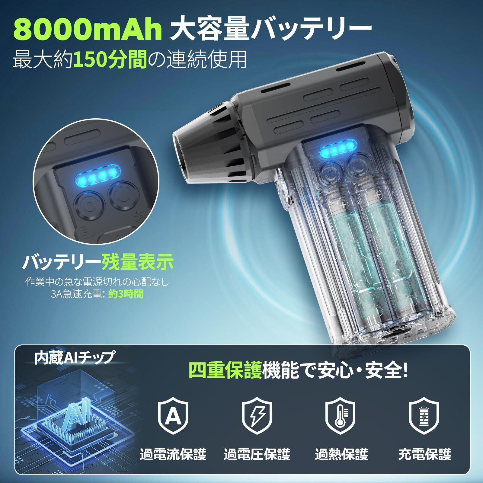 「8000mAhの大容量バッテリーを搭載し、充電式で長時間使用が可能です。また、過熱保護やAIによる節電機能も搭載しているため、安全に使用できます。」