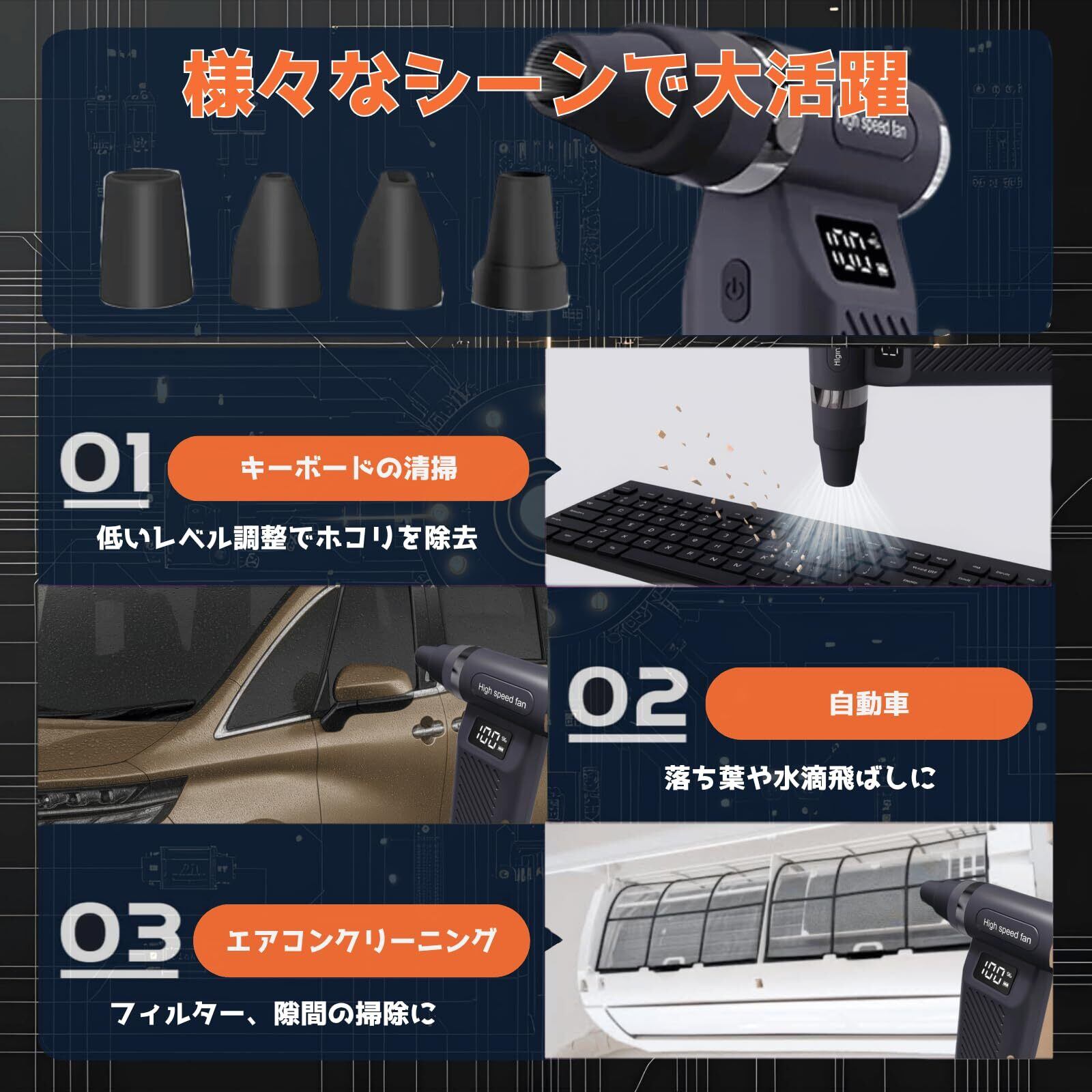 「PCやキーボード、エアコンはもちろん、洗車や空気入れにも万能に使える設計で、様々なシーンで大活躍します。また、デザインもスタイリッシュで、持ち運びにも便利です。」
