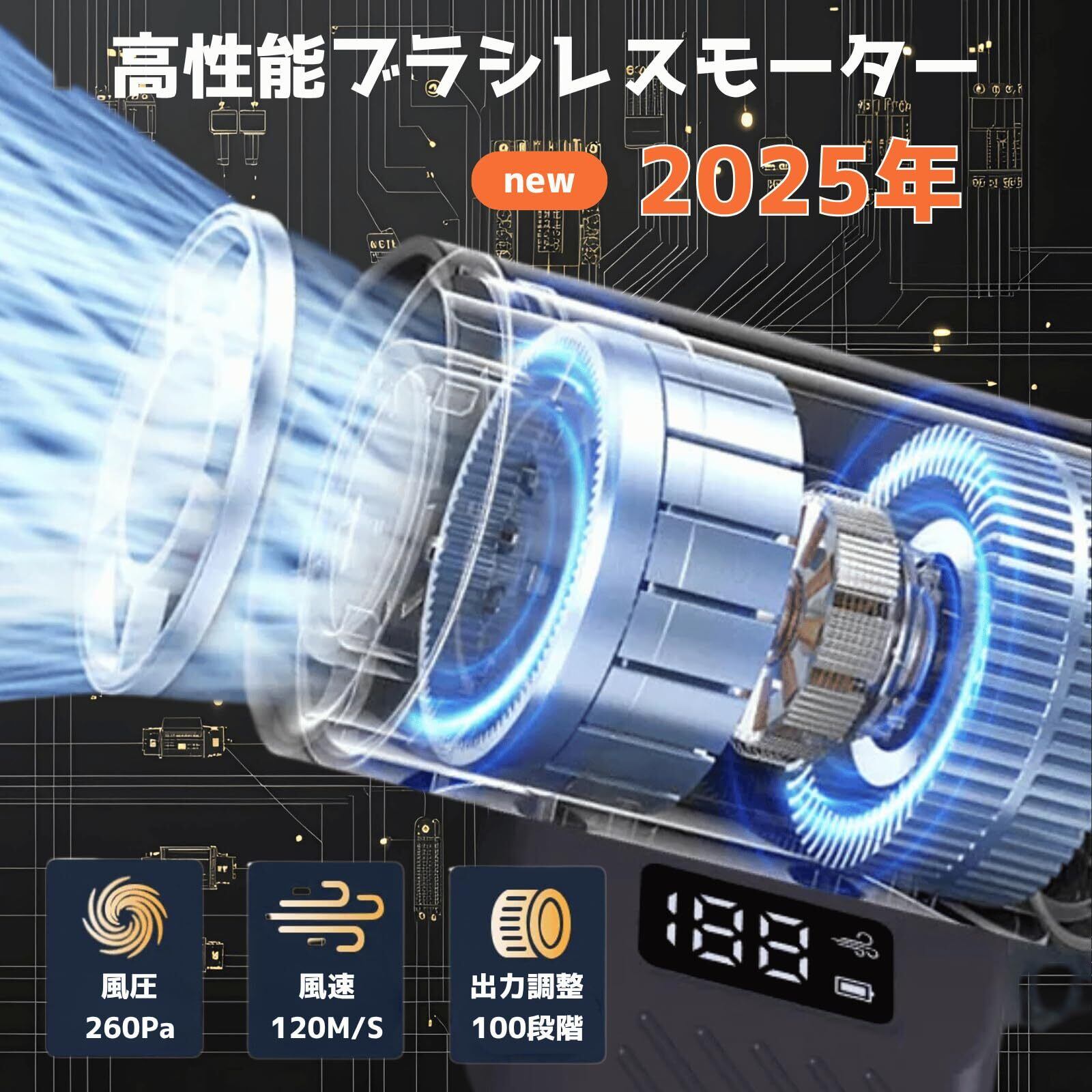 エアダスター 充電式 電動エアダスター エアダスター 強力 ダストブロワー ブロワー 洗車 100段階風量調整 超強力 最大風速120m/s 7500mAh大容量バッテリー PC掃除/空気入れ/キーボード/エアコン/洗車用 TypeC急速充電 日本語取扱説明書(ブラック)