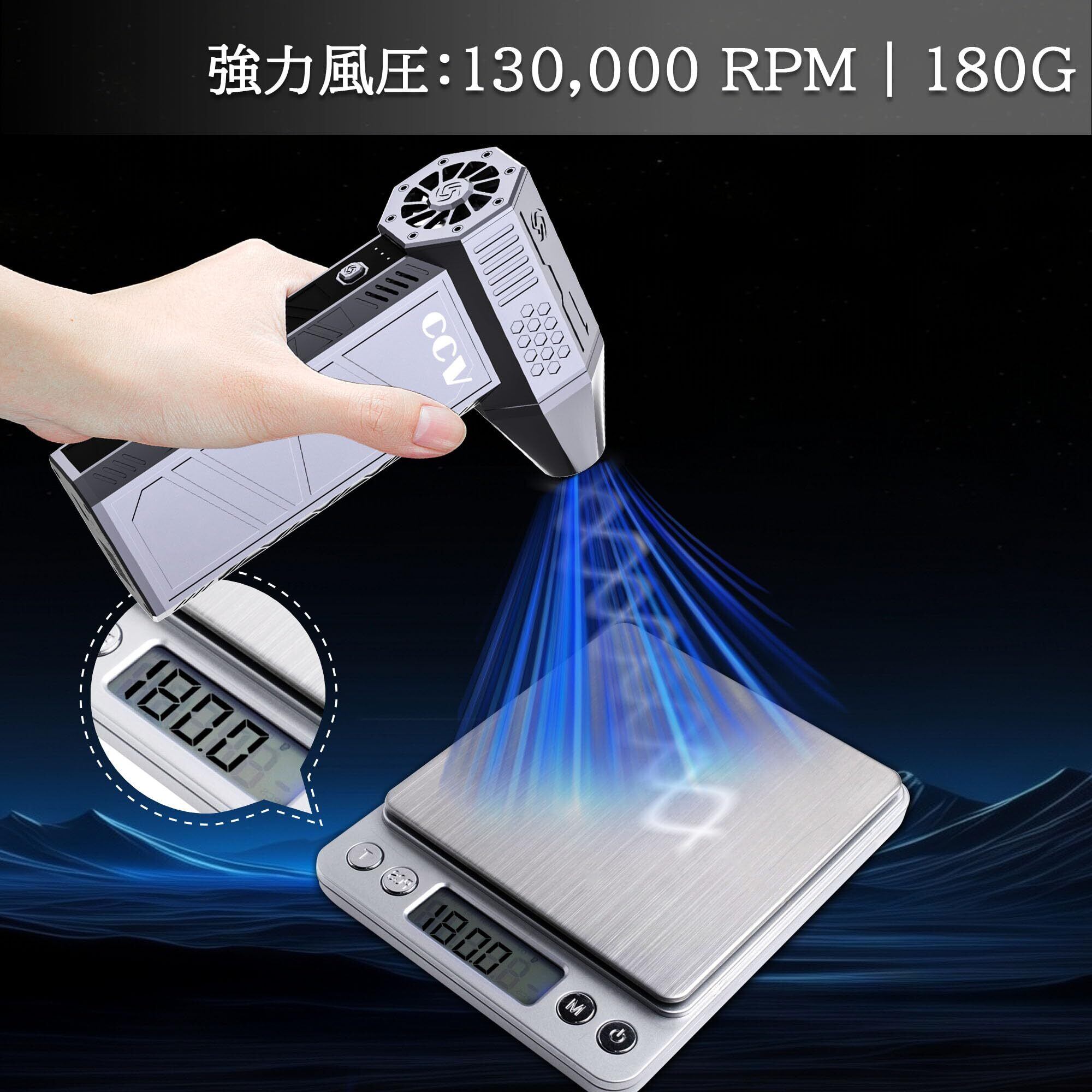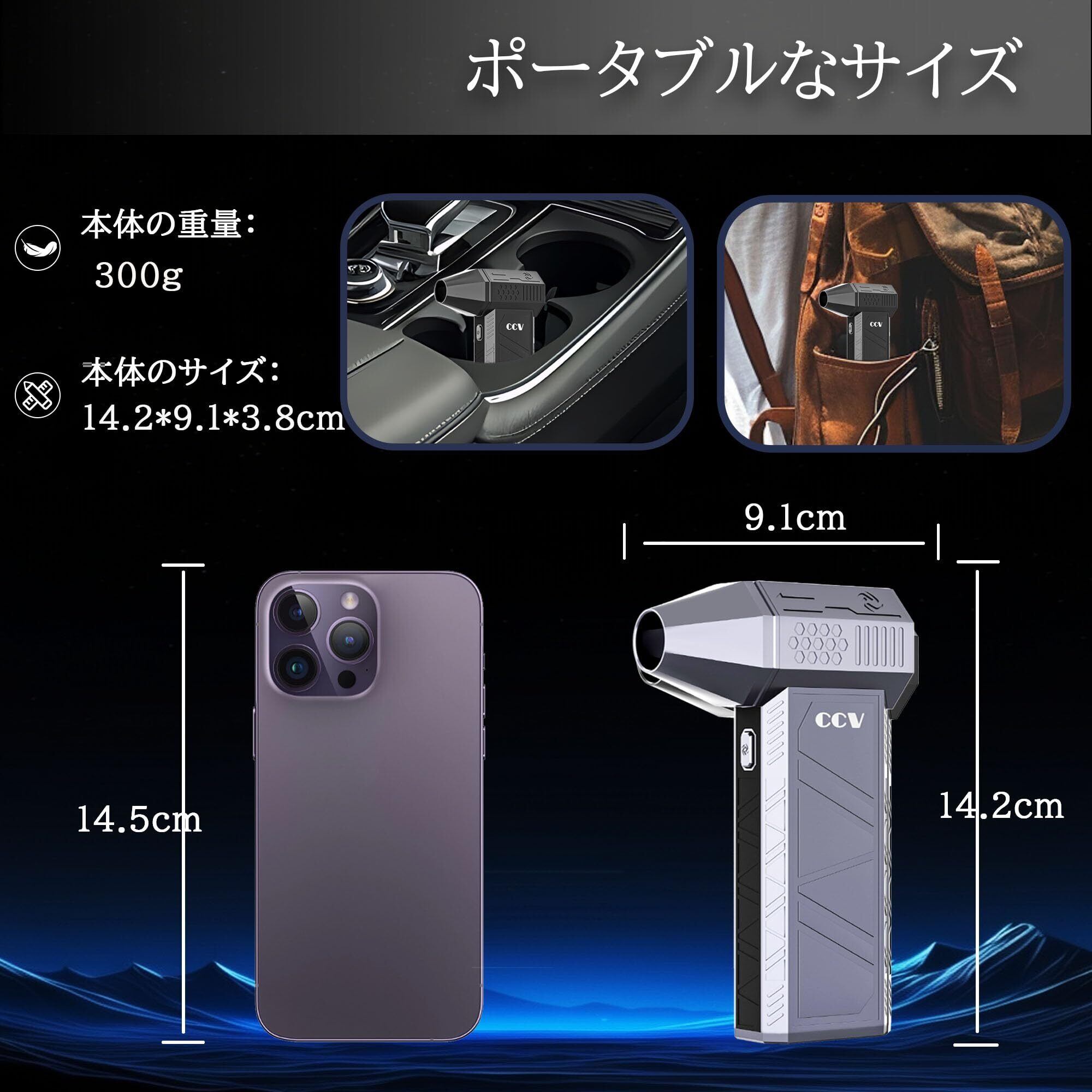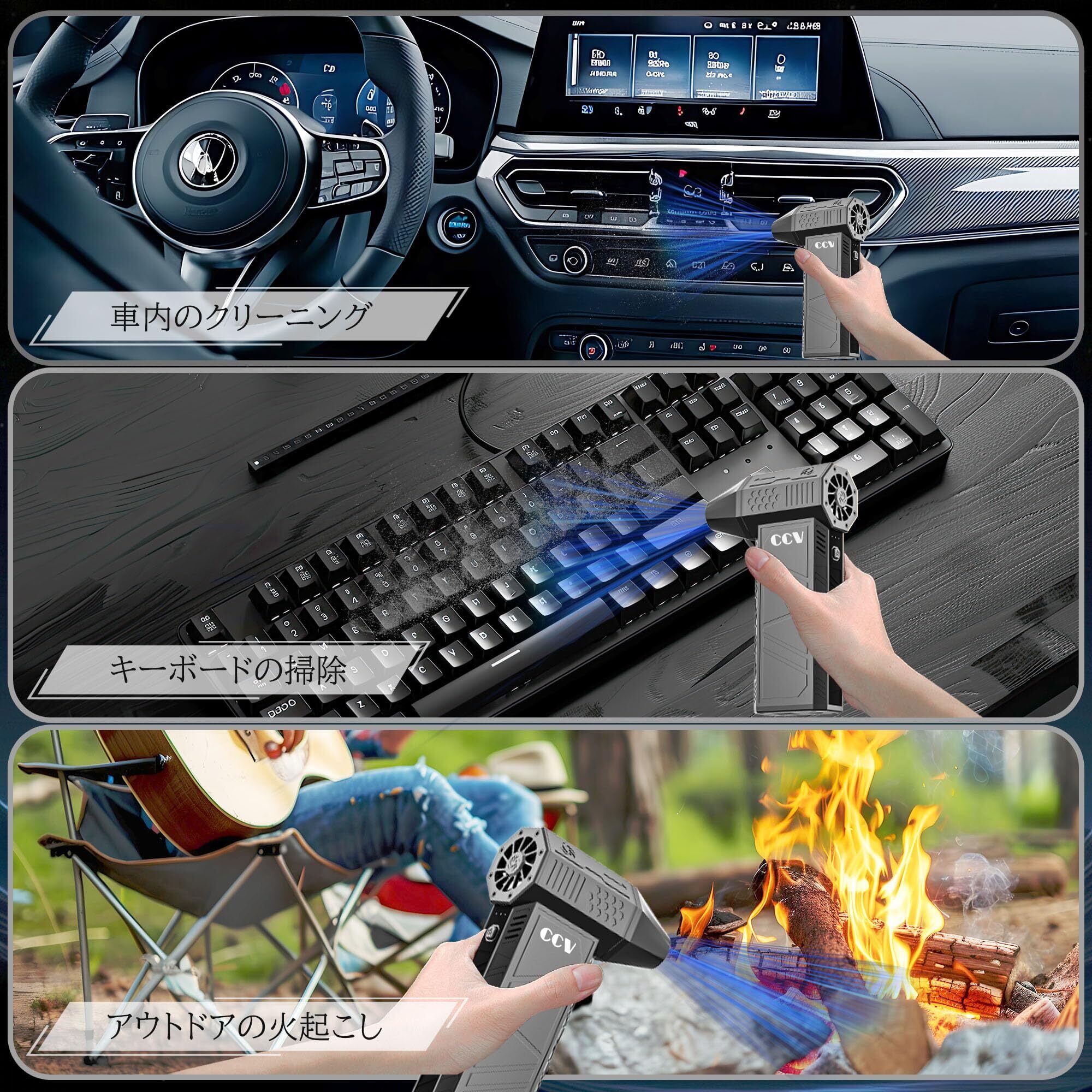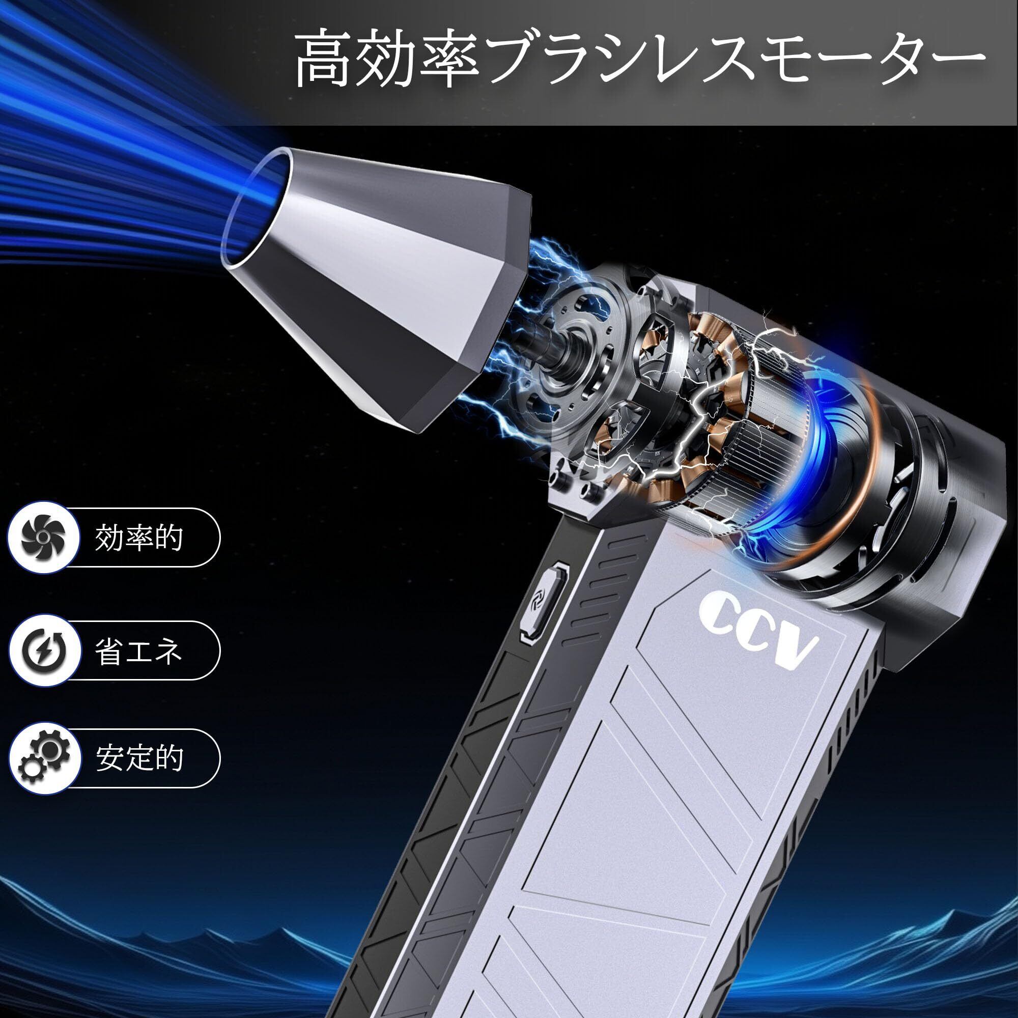 「『CCV エアダスター 強力ブロワー』は、150,000RPMの強力なモーターを搭載し、最大風速52m/sを実現した充電式エアダスターです!PCやキーボードの微細なホコリから、洗車後の水滴吹き飛ばしまで、多目的に活躍する設計です。」