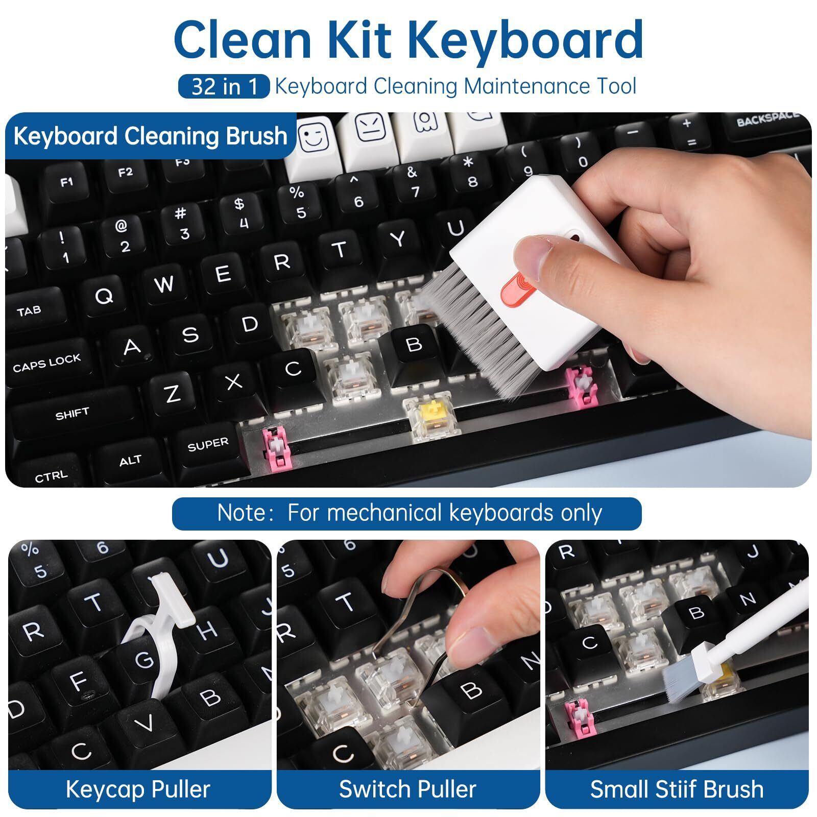 キーボードクリーニングキット:キーリムーバブルを搭載し、キーの取り外しが困難な問題を解決し、簡単なプッシュプル式高密度クリーニングブラシを使用して、隙間のホコリをすばやくクリーニングすることができます
