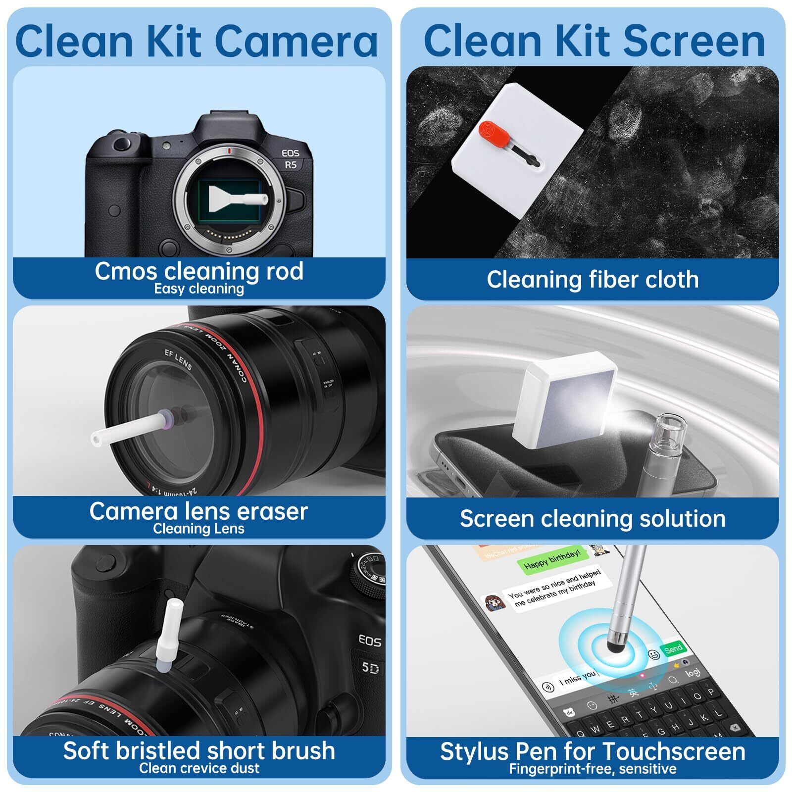 携帯電話のクリーニングキット:携帯電話スピーカーのクリーニングブラシを搭載し、スピーカーの穴の中のほこりや汚れをよりよくクリーニングし、スクリーンクリーニング布、携帯電話やタブレットの画面ほこりを迅速にクリーニングし、携帯電話の充電口クリーナーやSiMカード取り外しツールなどのクリーニングツール