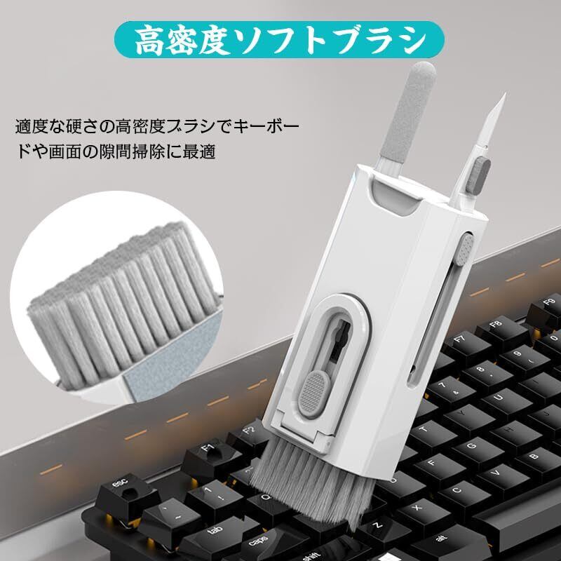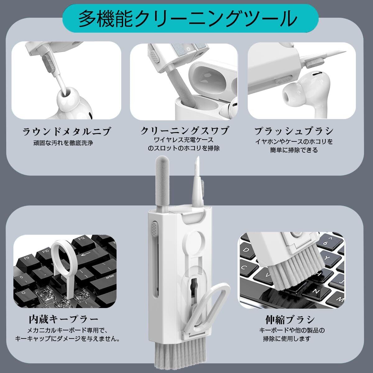 「このクリーニングツールは、イヤホン、キーボード、スマホ画面、充電ケースなど、様々なデバイスの清掃に特化した8つの機能を搭載しています。指紋やホコリを簡単に取り除き、隙間の汚れもしっかりお掃除。毎日のメンテナンスが手軽に行えます!」