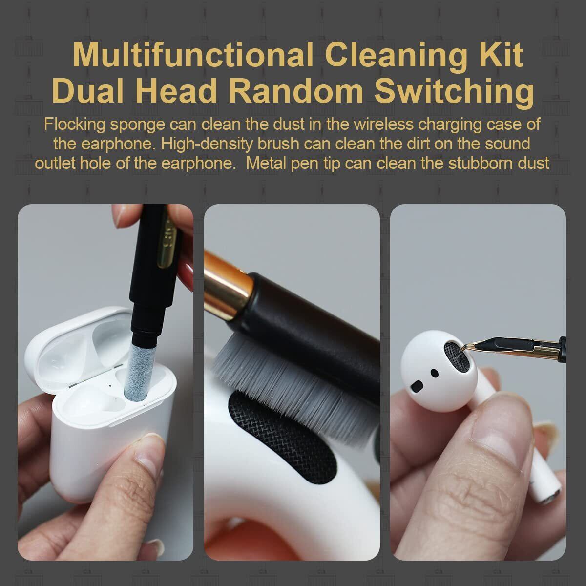多機能クリーニングキット:ブラシの内部にはイヤホンクリーニングペンを内蔵されています。植毛スポンジは、イヤホン充電ケースの掃除はできます。 高密度ブラシはイヤホンのほこりを落とすことができます。 金属製のペン先は頑固な汚れをきれいに掃除することができます。