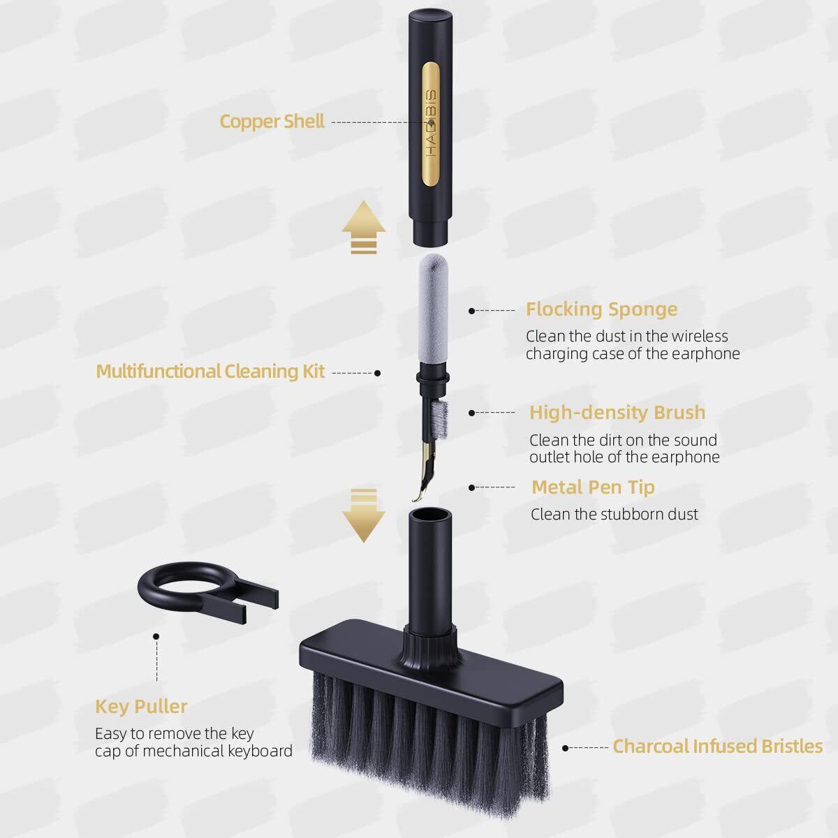 ヘッド隠しデザイン:ナイロン毛、植毛スポンジ、高密度ブラシ、金属ペン先とキートップ引抜工具を備え、Hagibis 5-in-1コンピュータークリーニングキット、さまざまなクリーニングニーズを対応します。