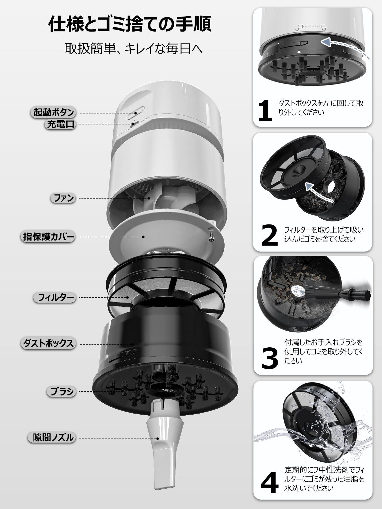 【コンパクト軽量】 重さ220g、81*81*104mmのミニ掃除機。高密度メッシュフィルターは洗濯可能で、消しゴムカスクリーナーとして。パッケージ内容:キーボード掃除機本体*1、ノズル*1、ブラシ*1、日本語説明書*1