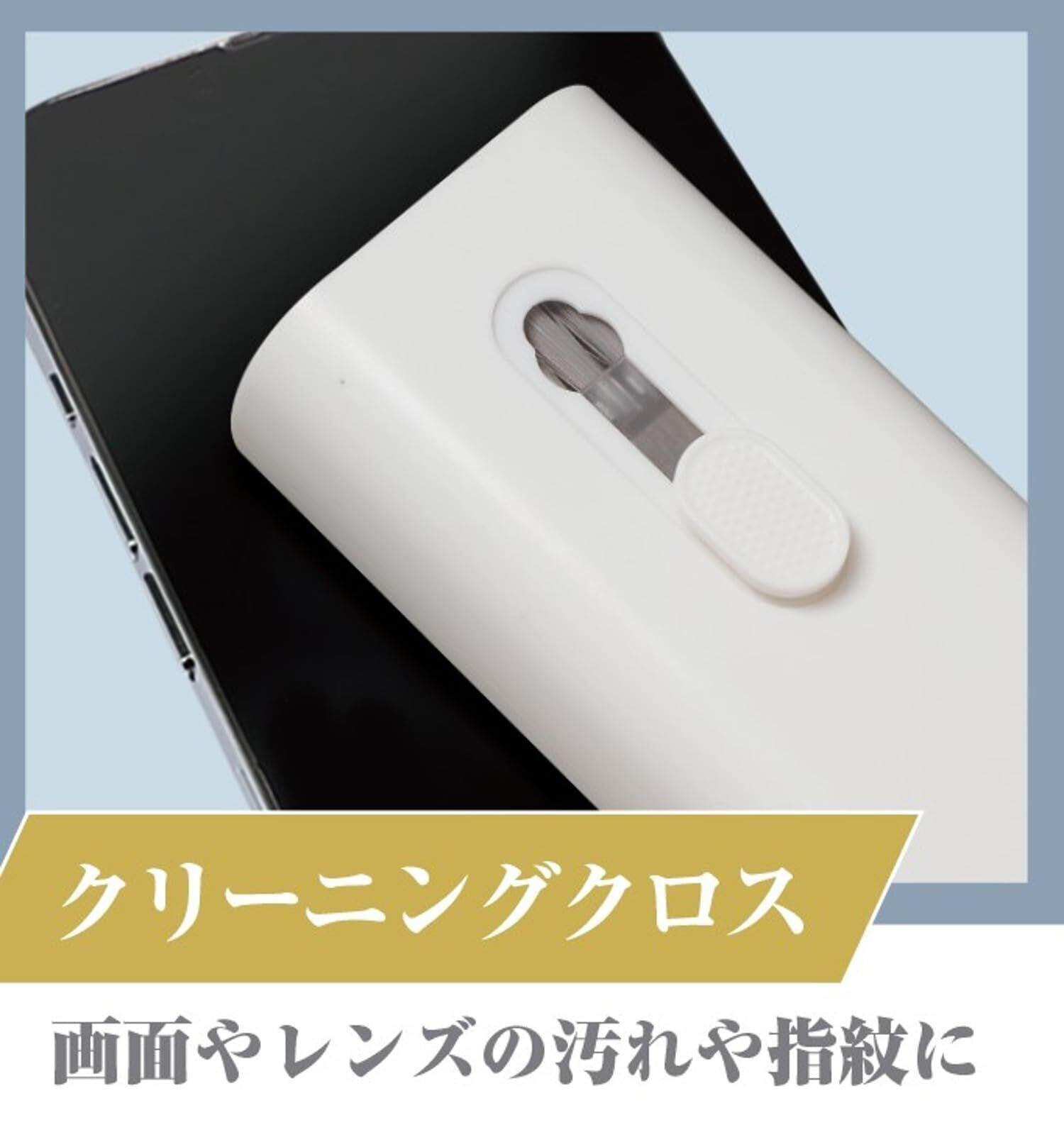 「このクリーニングキットは、デバイスに特化した多様なアタッチメントを含んでいます。イヤホンやスマホの隙間のほこりを簡単に取り除くだけでなく、レンズの指紋や汚れも効果的に除去できます。これ一つで、さまざまなデバイスのメンテナンスが可能です!」