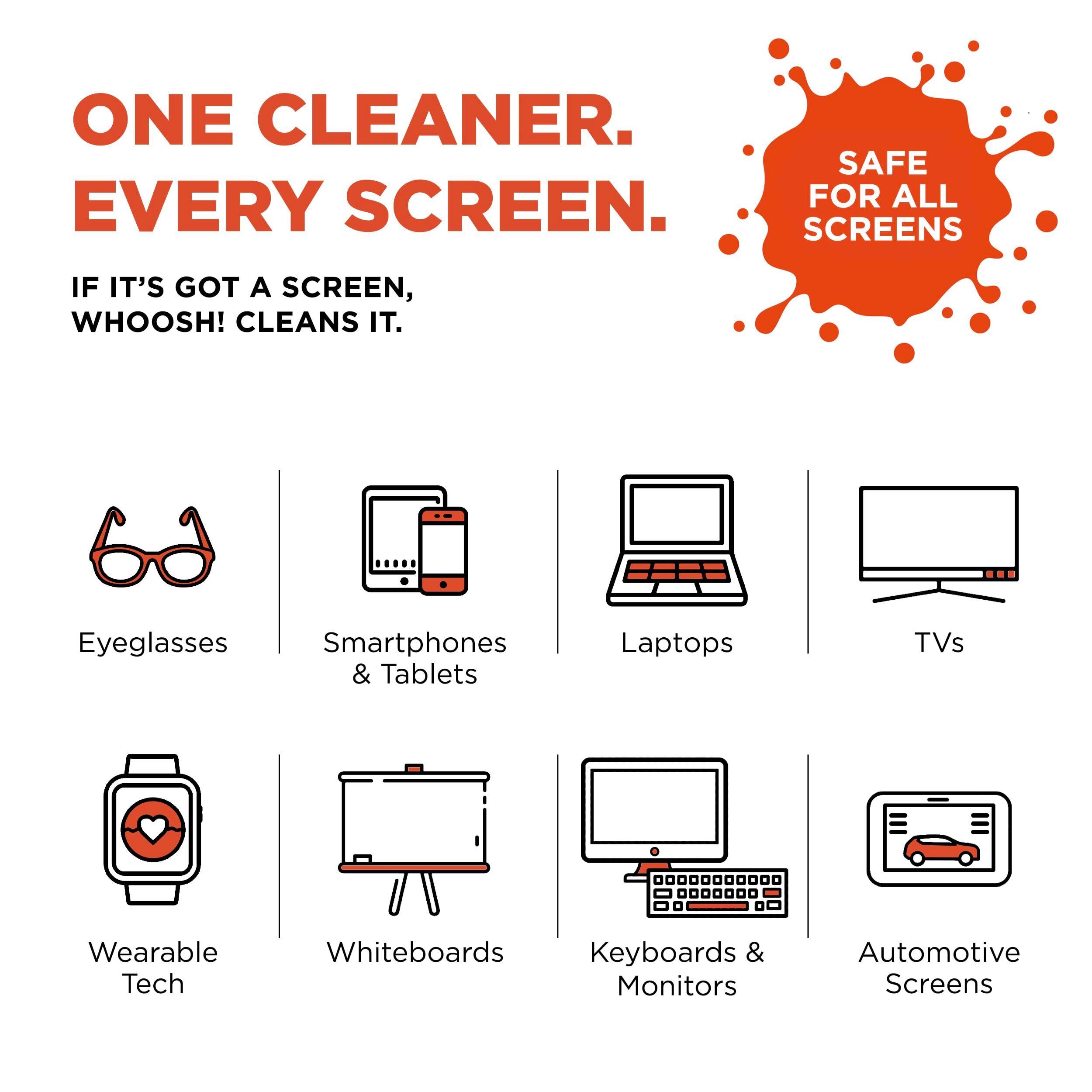 無臭フォーミュラ – 自宅の職場や外出先でScreen Shineをお使いください。WHOOSHはご家族や環境に害を及ぼすことはありません。アルコールやアンモニアは含まれていません。