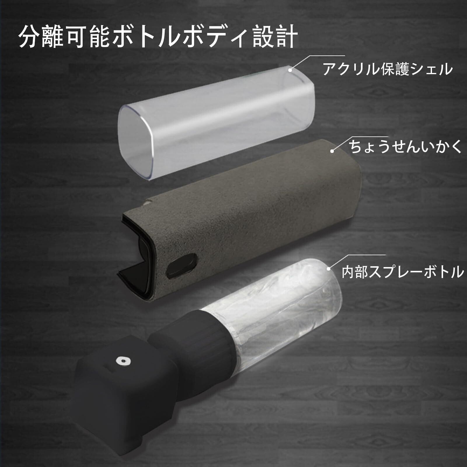 【分離可能なびんの設計は】スクリーンクリーナーは、スプレーボトル(洗剤なし)、マイクロファイバーボックス、保護ボックスの3つのパーツで構成されています。クリーニングおよび拭く 2in1の拭くべき余分清拭布のための必要性無し。洗剤の取り替えができ、とても便利です。
