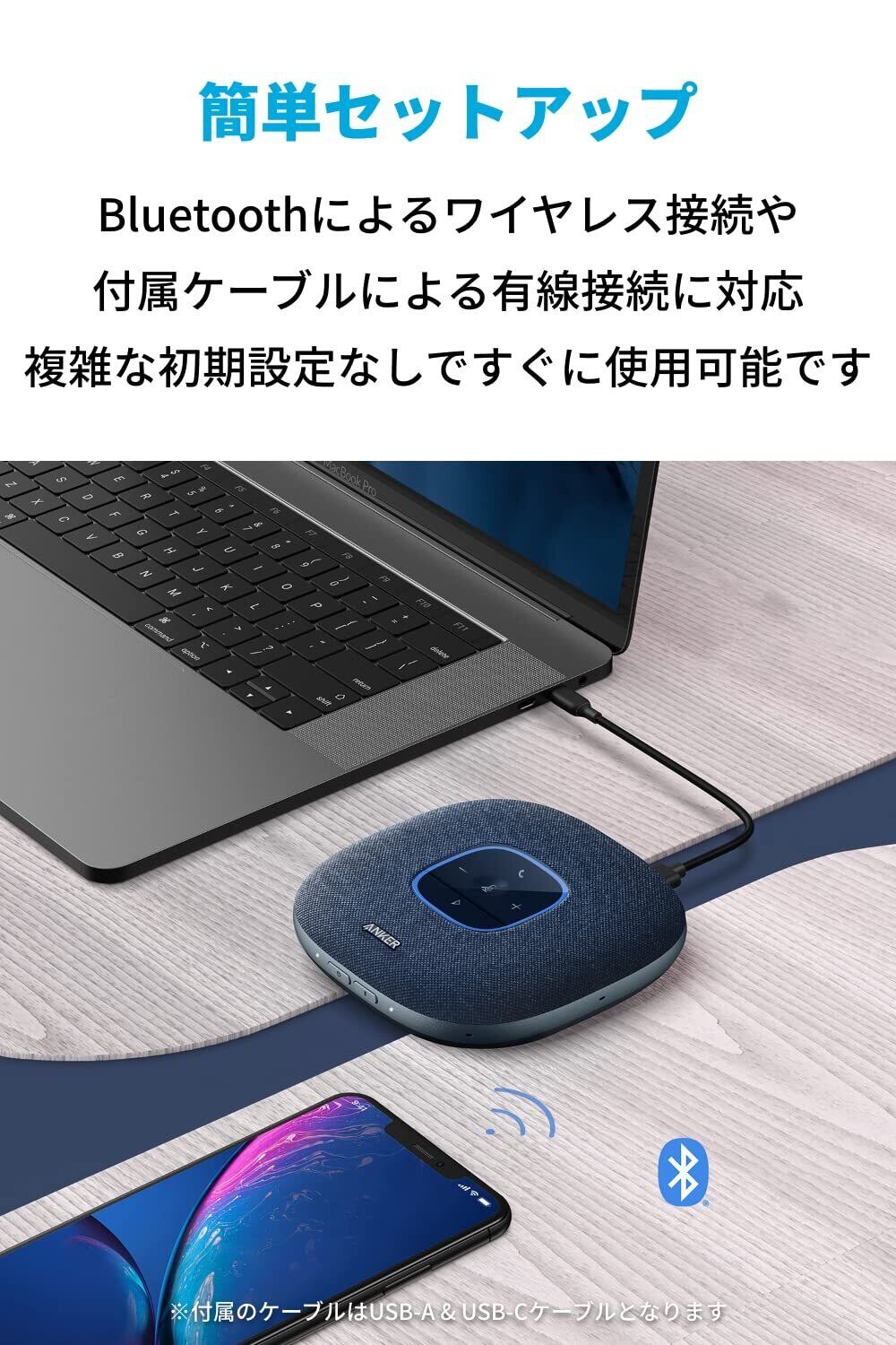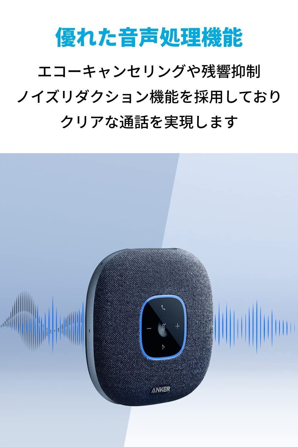 「『Anker PowerConf S3』は、特に会議やオンラインコールに最適化されたスピーカーフォンです!Bluetooth接続に対応し、USB-C経由での接続も可能なので、様々なデバイスと簡単に接続できます。」