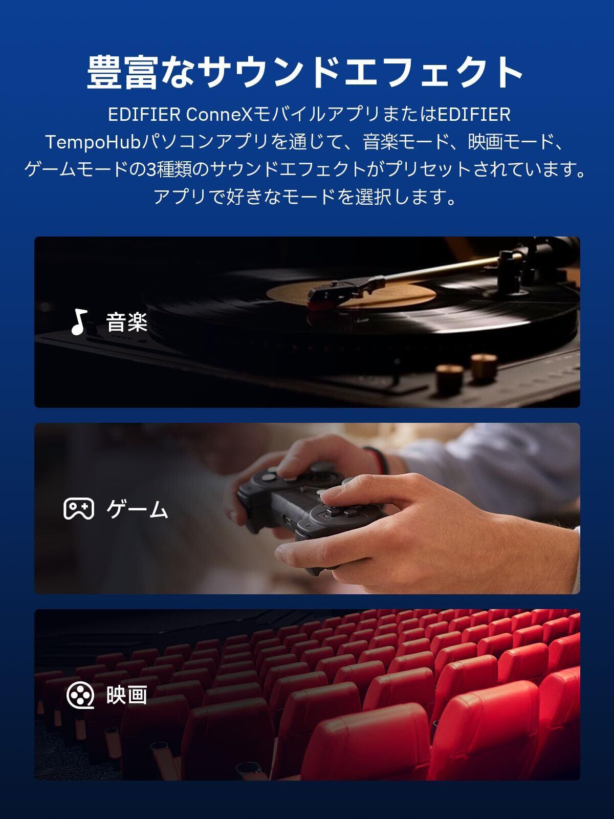 【専用アプリ】EDIFIER ConneXモバイルアプリまたはEDIFIER TempoHubパソコンアプリを通じて、音楽モード、映画モード、ゲームモードの3種類のサウンドエフェクトがプリセットされています。アプリで好きなモードを選択します。