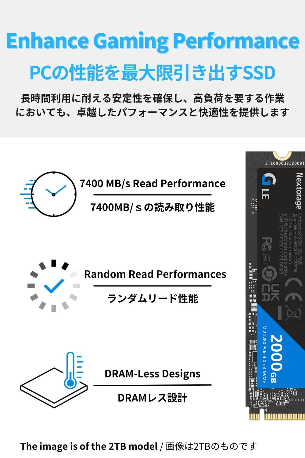 「『Nextorage 1TB SSD』は、驚異的な速度を実現する内蔵SSDです!最大転送速度7400MB/sを誇り、データの読み書きが超高速化され、ゲーミングやクリエイティブな作業環境を格段に向上させる一品です。特にPS5との組み合わせでその性能を実感できます。」