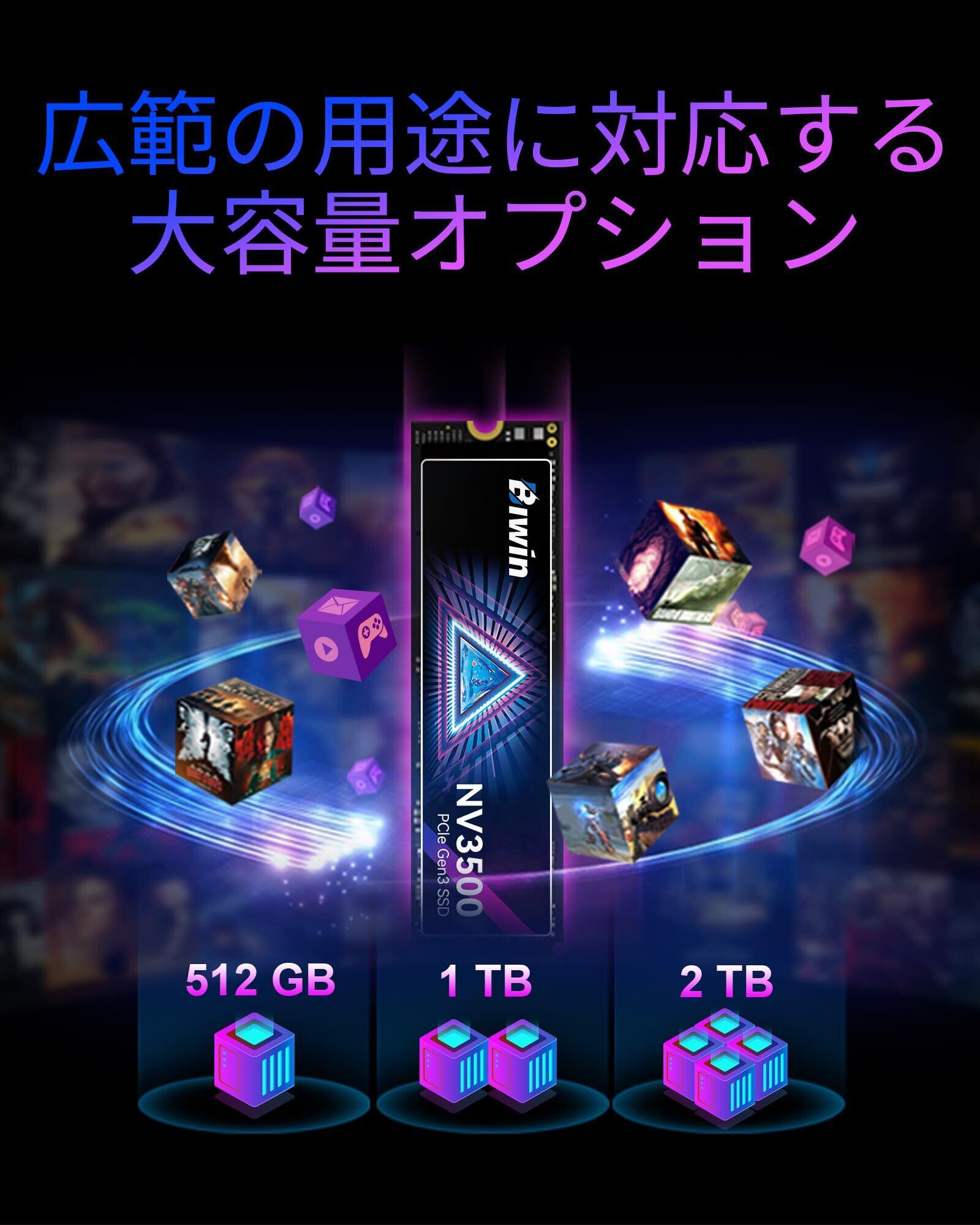 「PCIe Gen3×4に対応し、高速なデータ転送を実現。ゲームや動画編集など、高負荷の作業でもストレスなく使用できるため、より快適なPC操作が可能です。512GBの大容量で、大切なデータをたっぷり保存できます。」