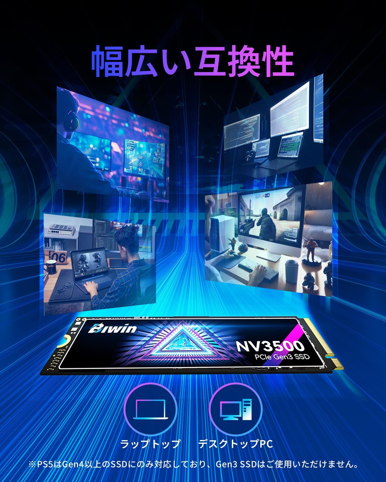 【Biwin NV3500】Biwin NV3500はPCIe 3.0 SSDの限界性能に挑戦し、高性能コントローラと厳選された高品質フラッシュメモリを搭載しており、シーケンシャル読込速度は最大3500MB/sに達します。標準的なM.2 2280片面設計を採用したNV3500は、PS5/PS5 Pro、デスクトップPC、ノートPCにも幅広く対応可能。