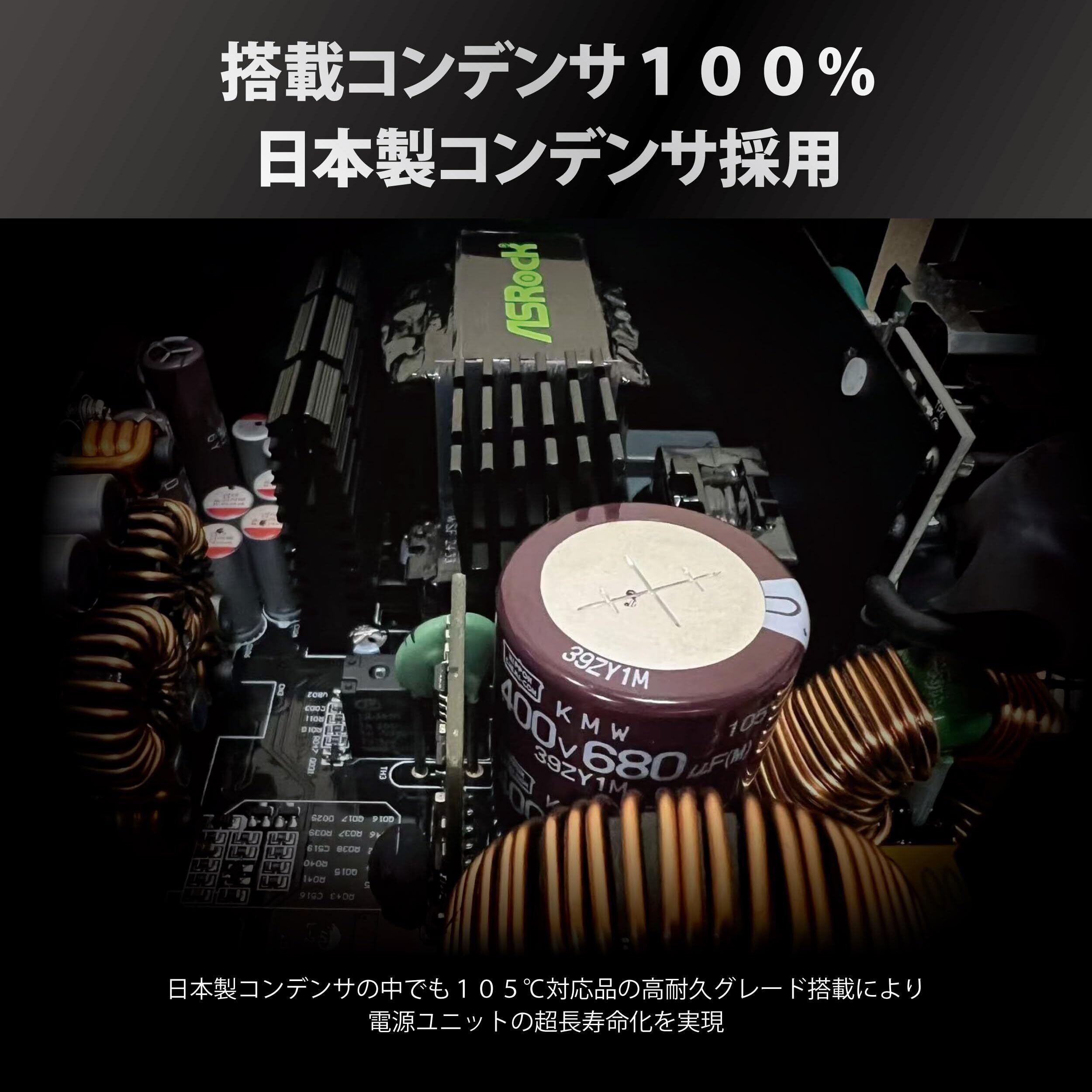 100%日本製の高耐久シリーズの105℃コンデンサを採用し安定した電力を供給します