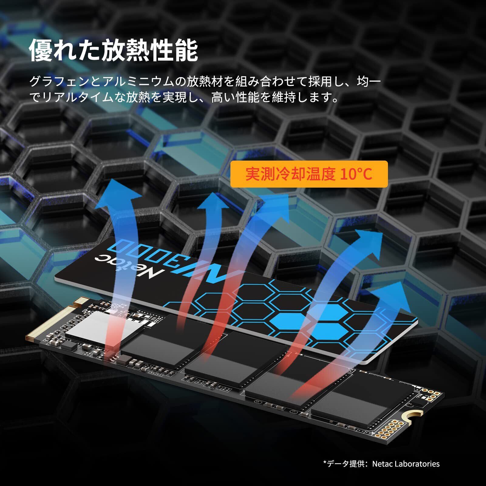 【超薄グラフェンヒートシンク付き・性能安定】熱伝導に優れたグラフェンを厚さ0.8mmのアルミ合金製ヒートシンクにシルク印刷しています。ヒートシンクをコントローラや3D NANDフラッシュの表面にしっかり密着させ、熱を効率的に放出し、SSDの高温状態を素早く緩和、安定した高性能を維持します。実測では、グラフェンヒートシンクによりSSDの温度を最大10℃低減することができます。
