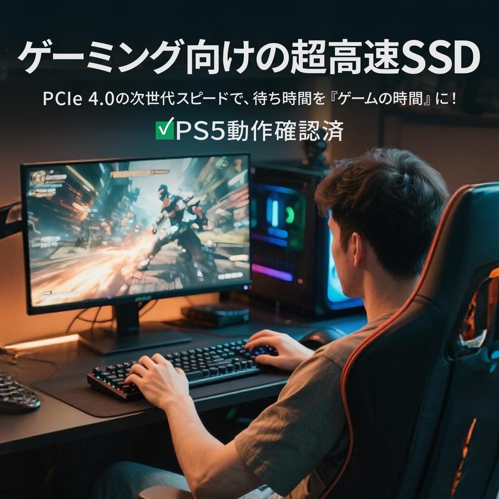 「このSSDは、最新のゲーミングPCはもちろん、新型PS5での動作確認済みです。さらに、クリエイティブな作業やデータベース管理など、多様なシーンでの使用にも対応しており、どんな環境でもそのポテンシャルを発揮します!」