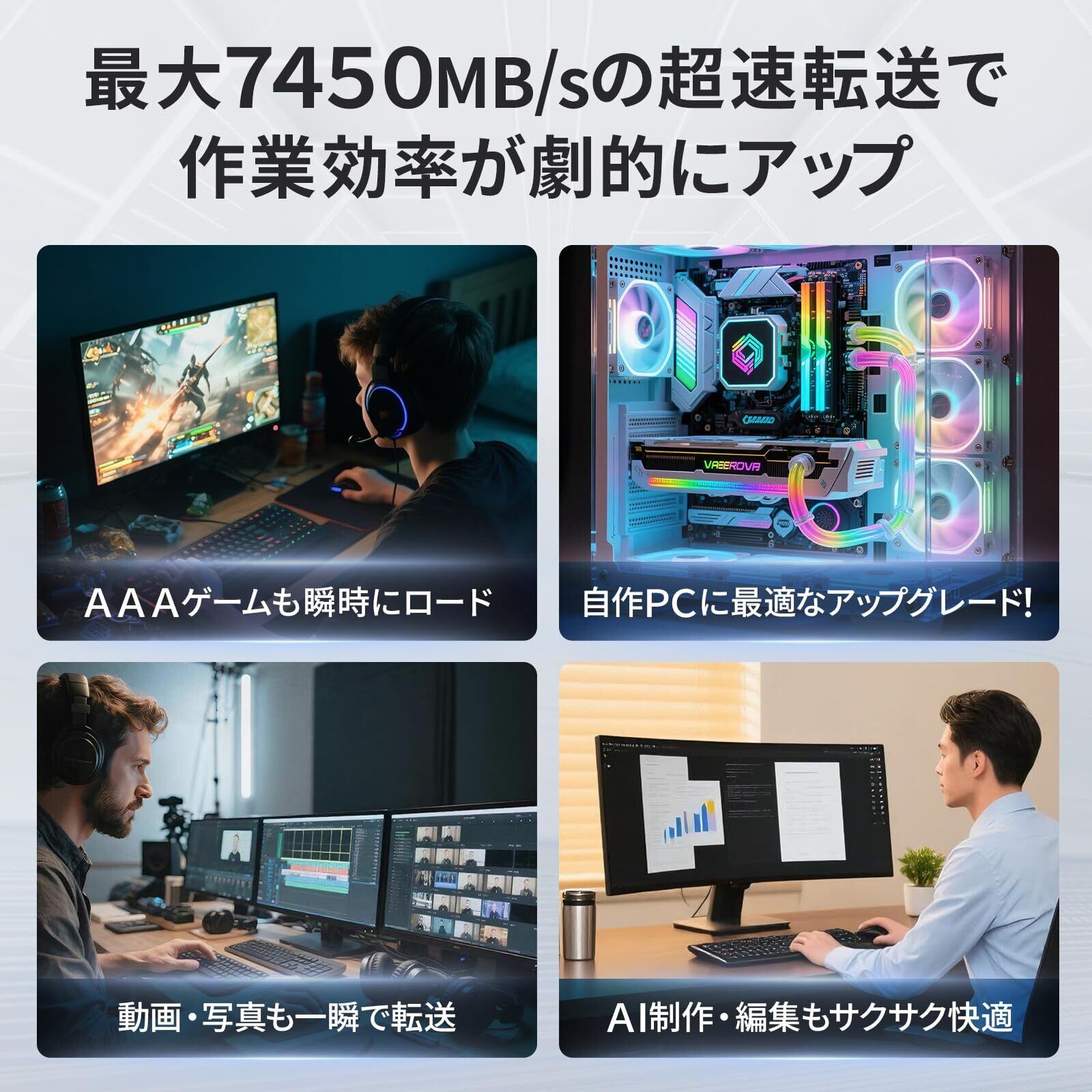 - 読取り最大7450MB/s、書込み最大6600MB/sで型破りな高速性!