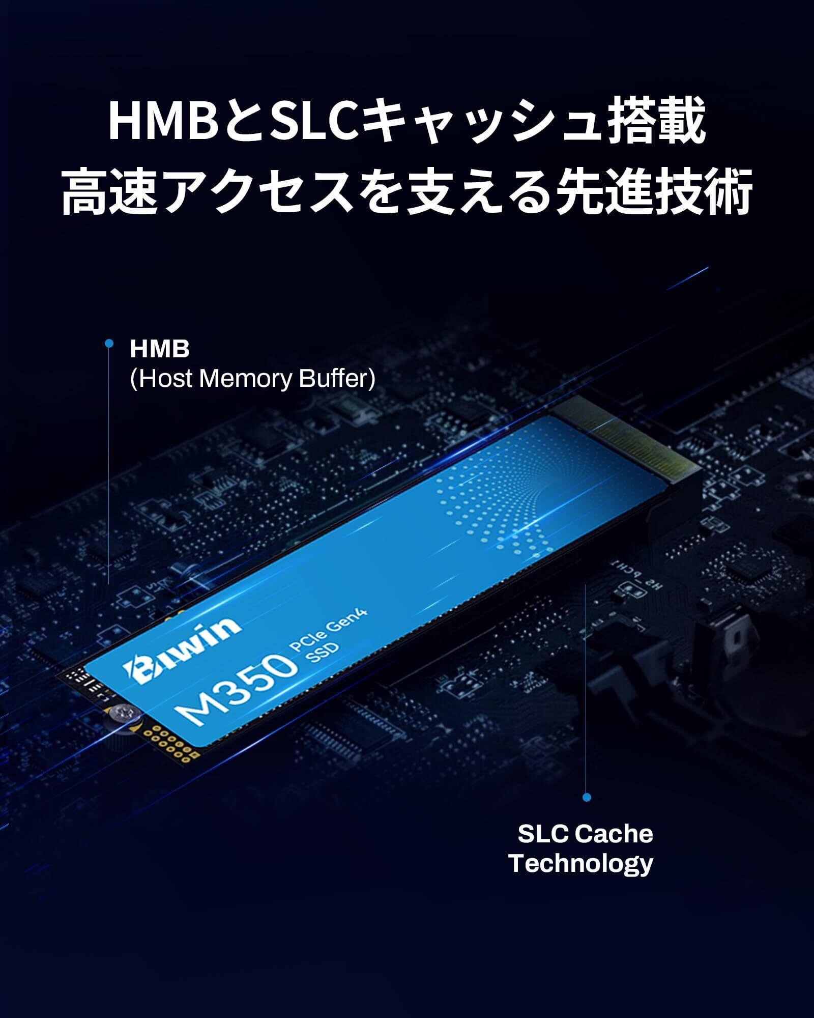 【HMB+SLCキャッシュ】DRAMを搭載せずに高速動作を実現するHMBとSLCキャッシュ技術を組み合わせ、ランダムアクセスの最適化と転送速度の安定化を両立。起動やアプリの立ち上げも快適に。