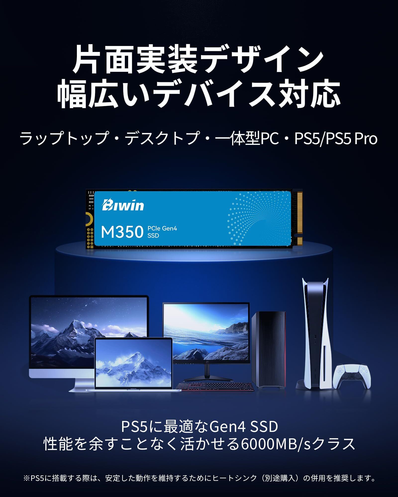Biwin M350 2TB SSD M.2 Type 2280 PCIe Gen4×4 最大読込:5200MB/s (R:5200MB/s、W:4800MB/s) 内蔵SSD 高耐久 PS5/PS5 Pro動作確認済み メーカー5年