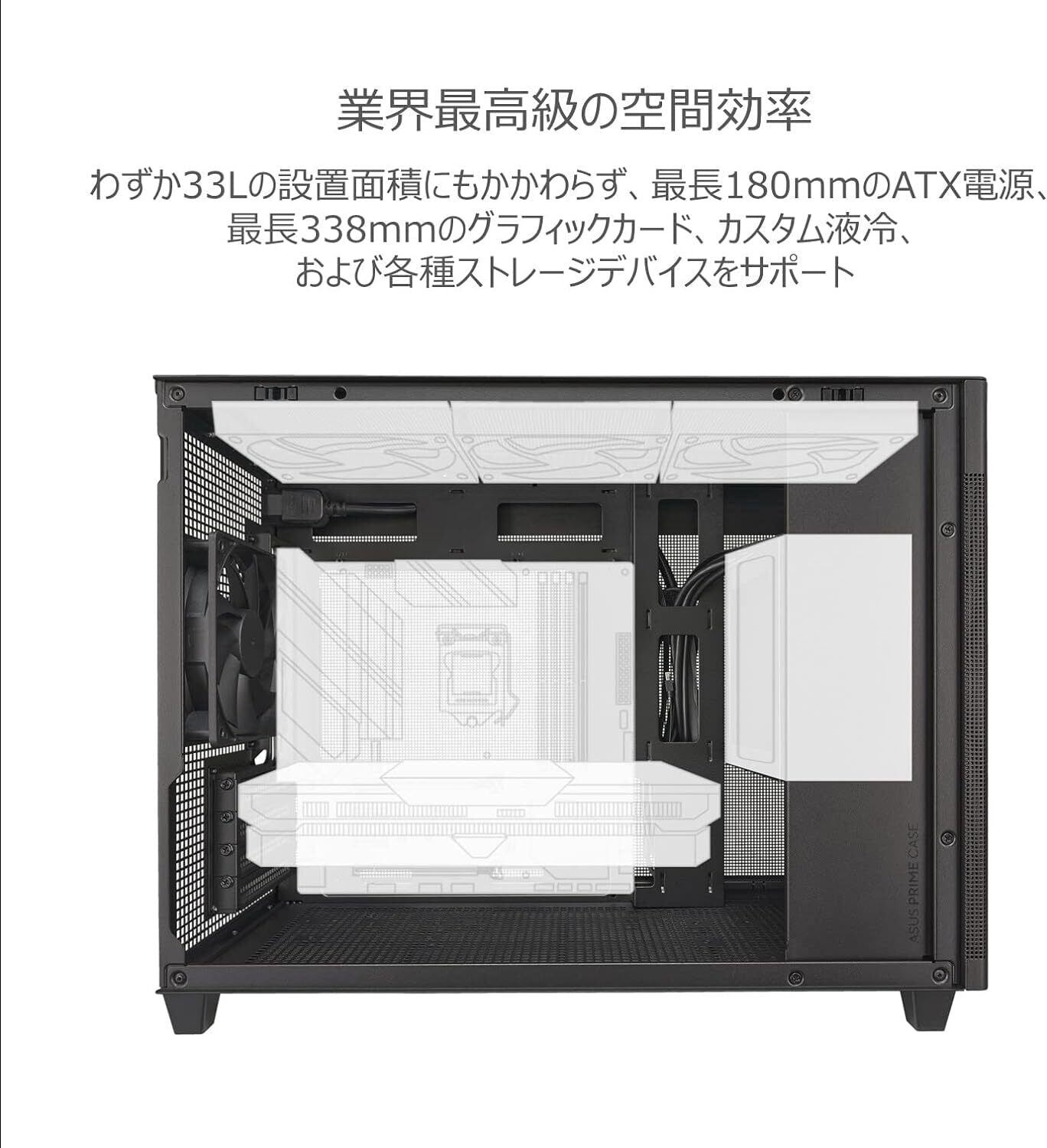 「PRIME CASE MESHは、Micro ATX、Mini-ITXマザーボードに対応しており、複数のストレージデバイスやグラフィックカードの搭載が可能です。最大320mmのGPUや164mmのCPUクーラーにも対応し、システムの強化をサポートします。また、配線の整理がしやすい設計になっています。」