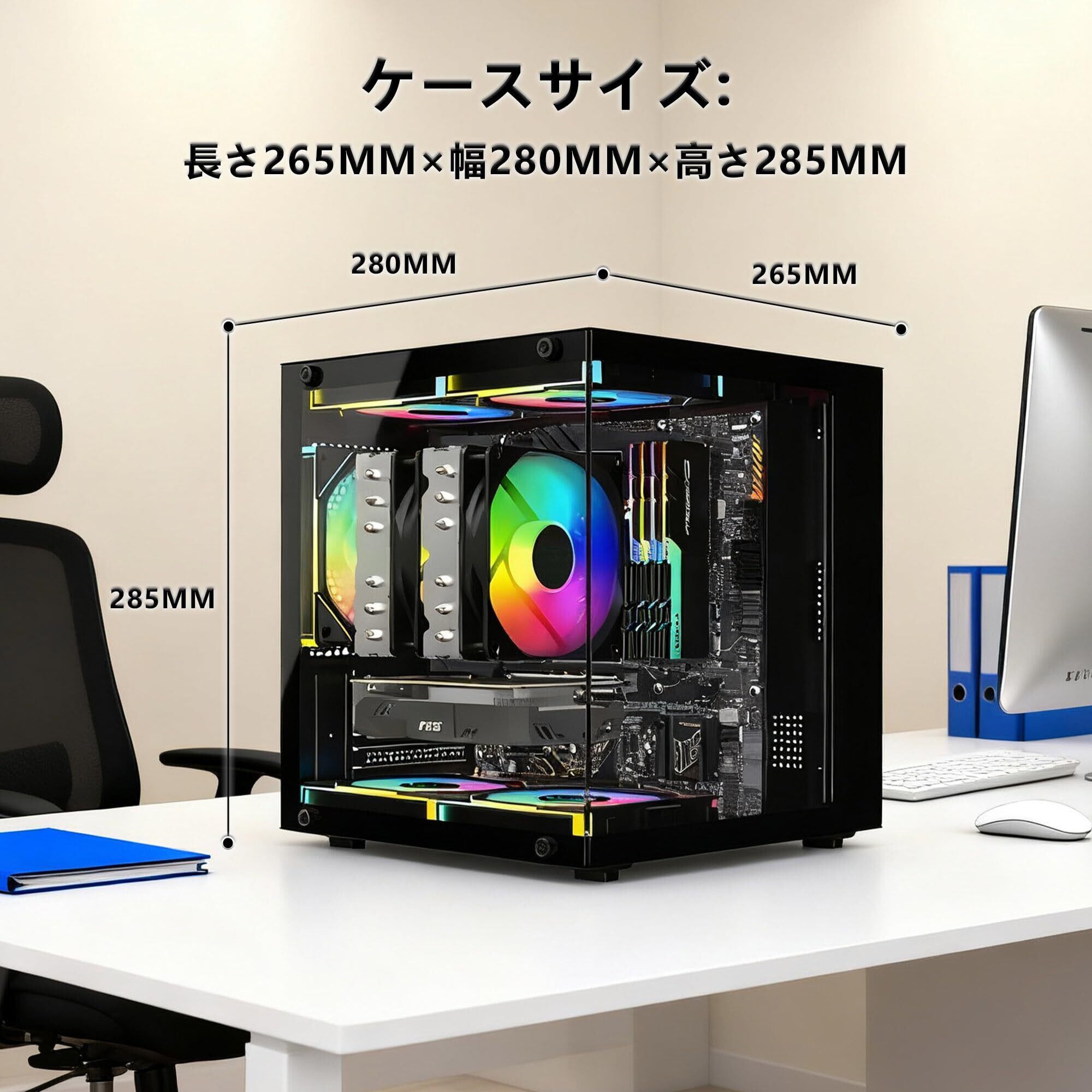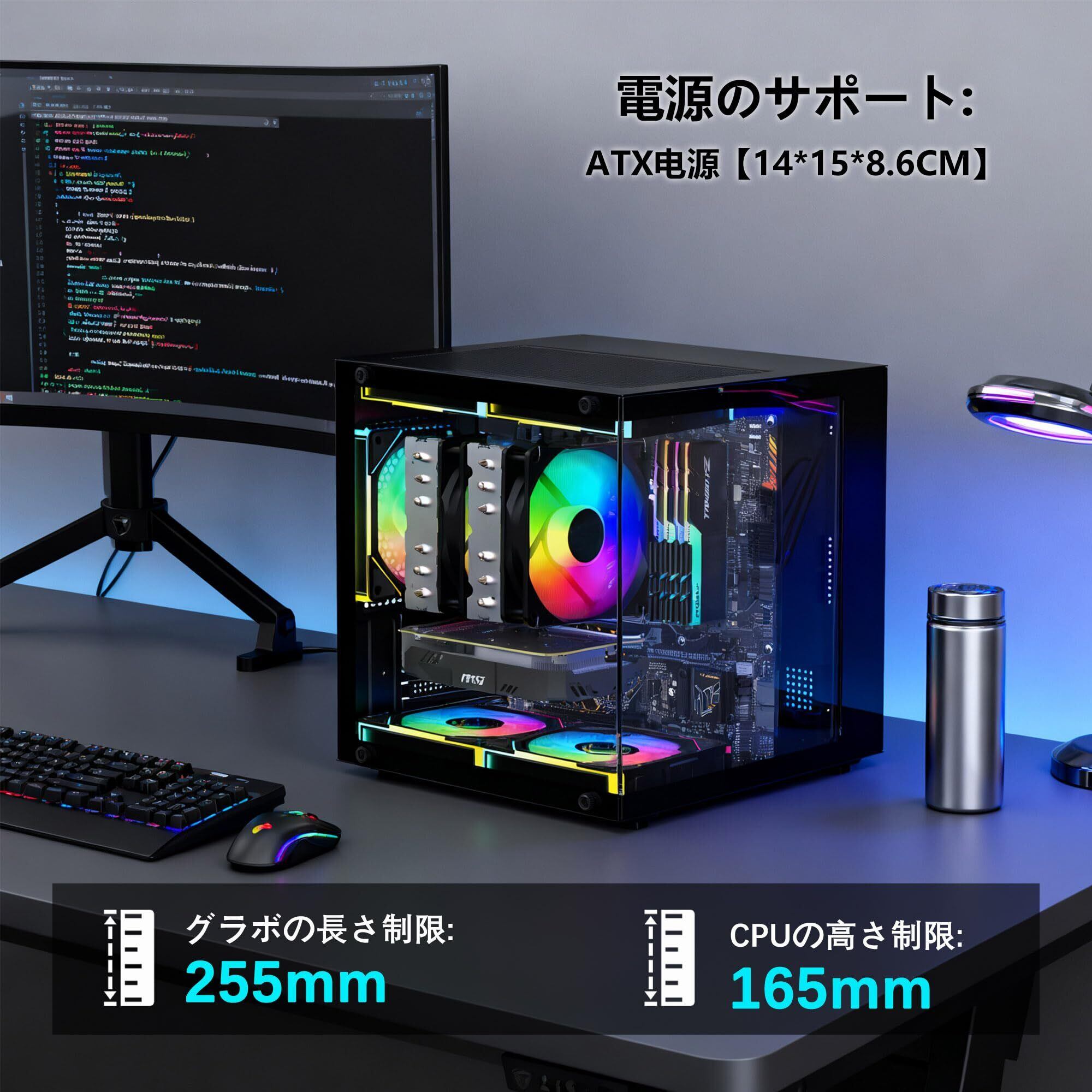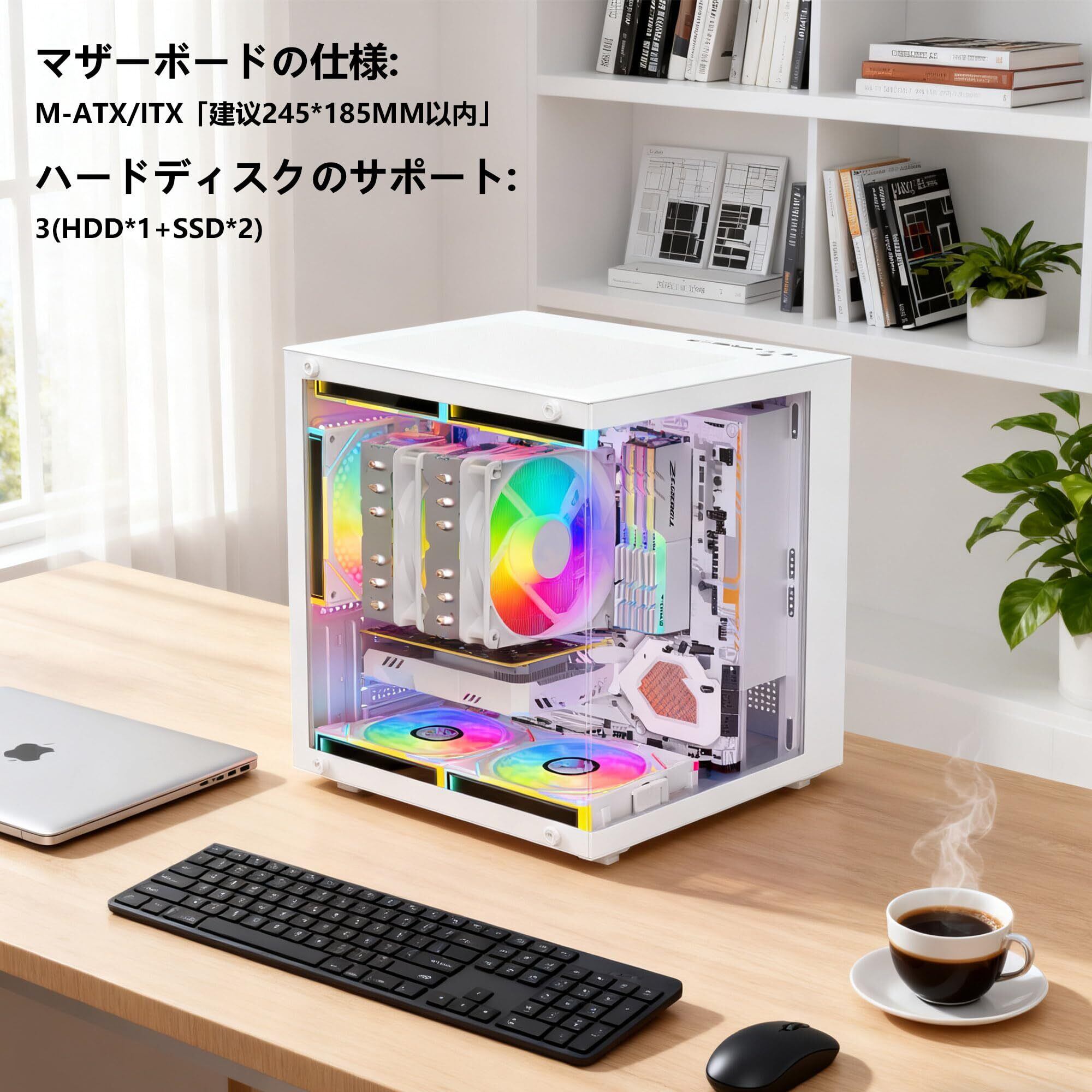 「このPCケースは、限られたスペースでもパワフルなPCを構築できるように設計されています。Mini-ITXおよびMicroATXマザーボードに対応しており、デスク上の小さなスペースでも容易に設置可能です! 軽量なため、持ち運びの際にも便利です。」