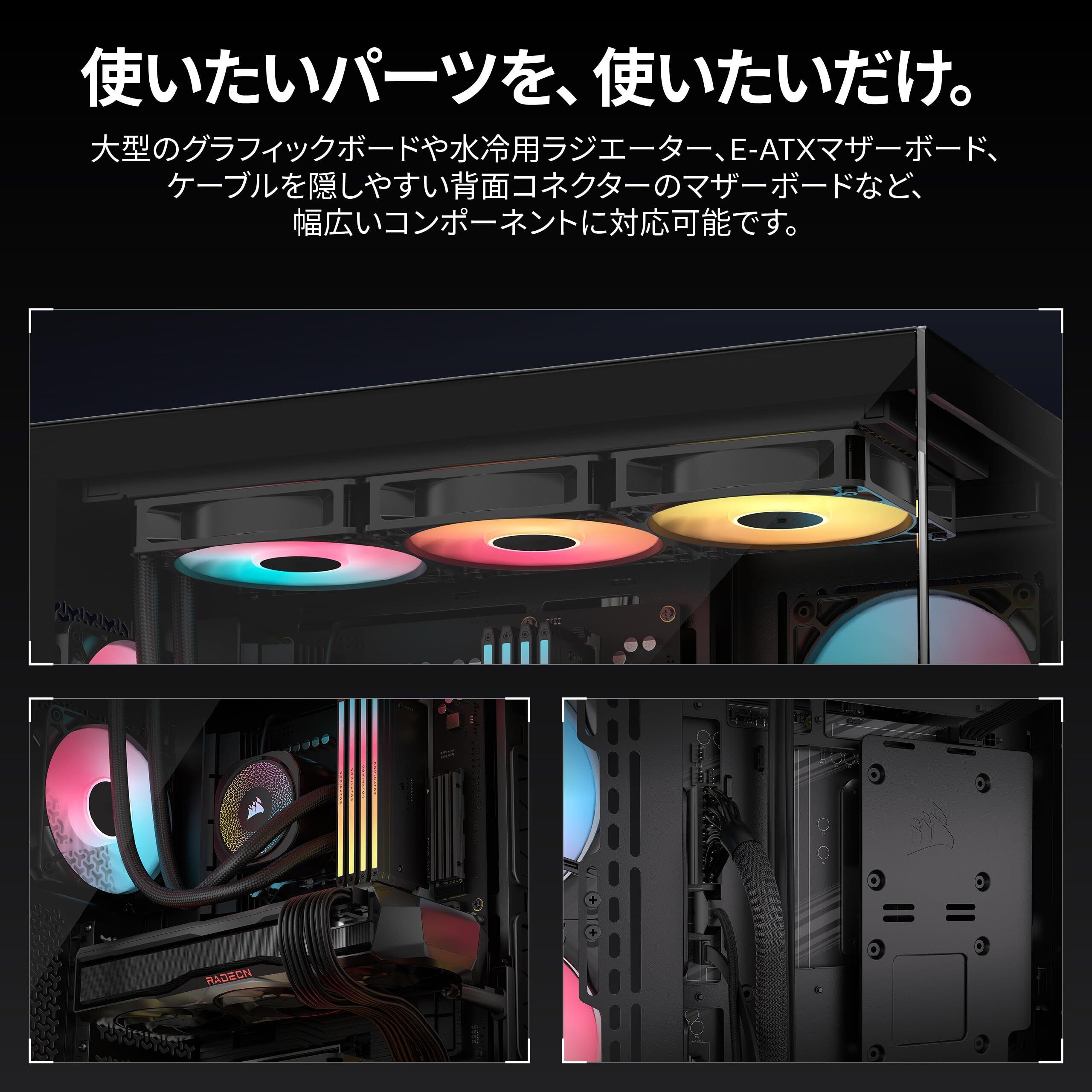 「最大10基の120mmファンを搭載でき、さらに逆配線対応のマザーボード互換性を持つため、各種ハードウェアとの組み合わせが自由自在です。また、サイドパネルは工具不要で簡単に取り外し可能なので、メンテナンスも楽々です!」